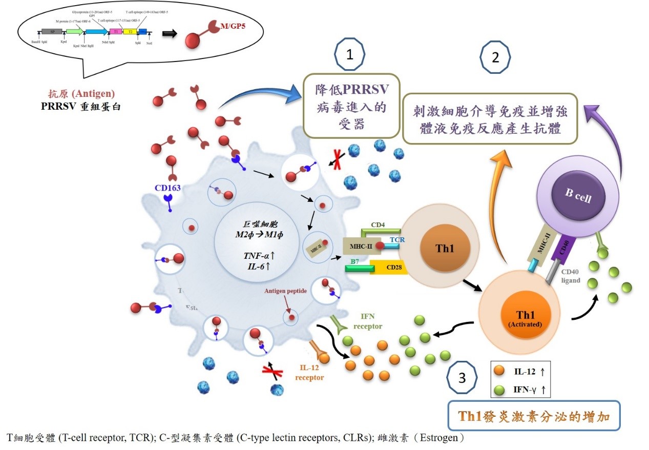 重組蛋白作用於豬肺泡巨噬細胞的M1復極化,降低病毒進入的受器,對歐洲及北美株有廣泛的保護作用,可有效降低藍耳病、流產損失、死胎及繁殖障礙的發生率及死亡率。為母豬和仔豬提供全面的保護。