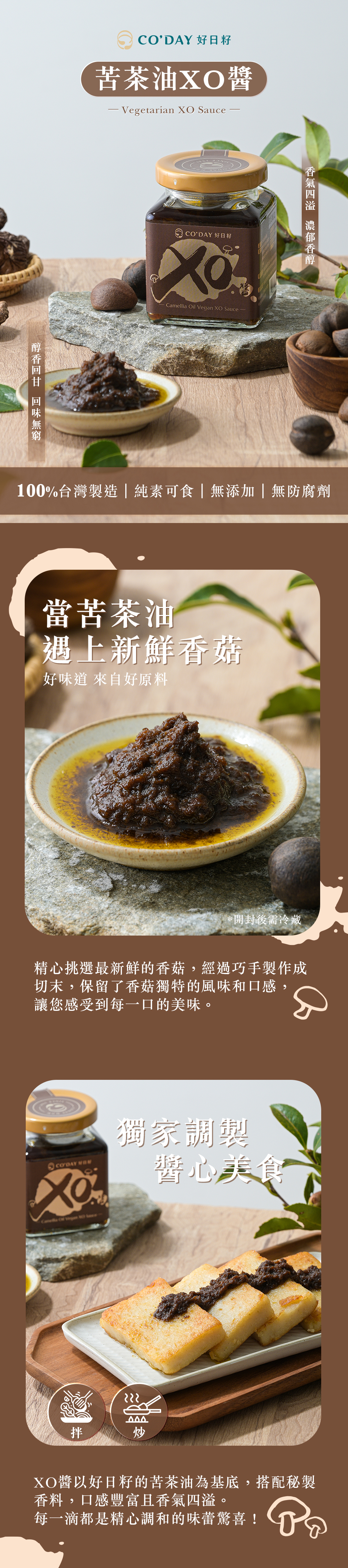 XO醬以好日籽的苦茶油為基底,搭配精心挑選最新鮮的香菇,經過巧手製作成切末,保留了香菇獨特的風味和口感,讓您感受到每一口的美味。