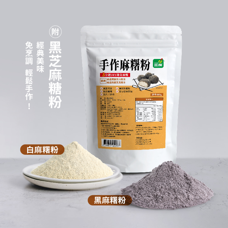 淨重:480公克/袋(白麻糬粉60公克x3包、黑麻糬粉60公克x3包、黑芝麻糖粉20公克x6包)