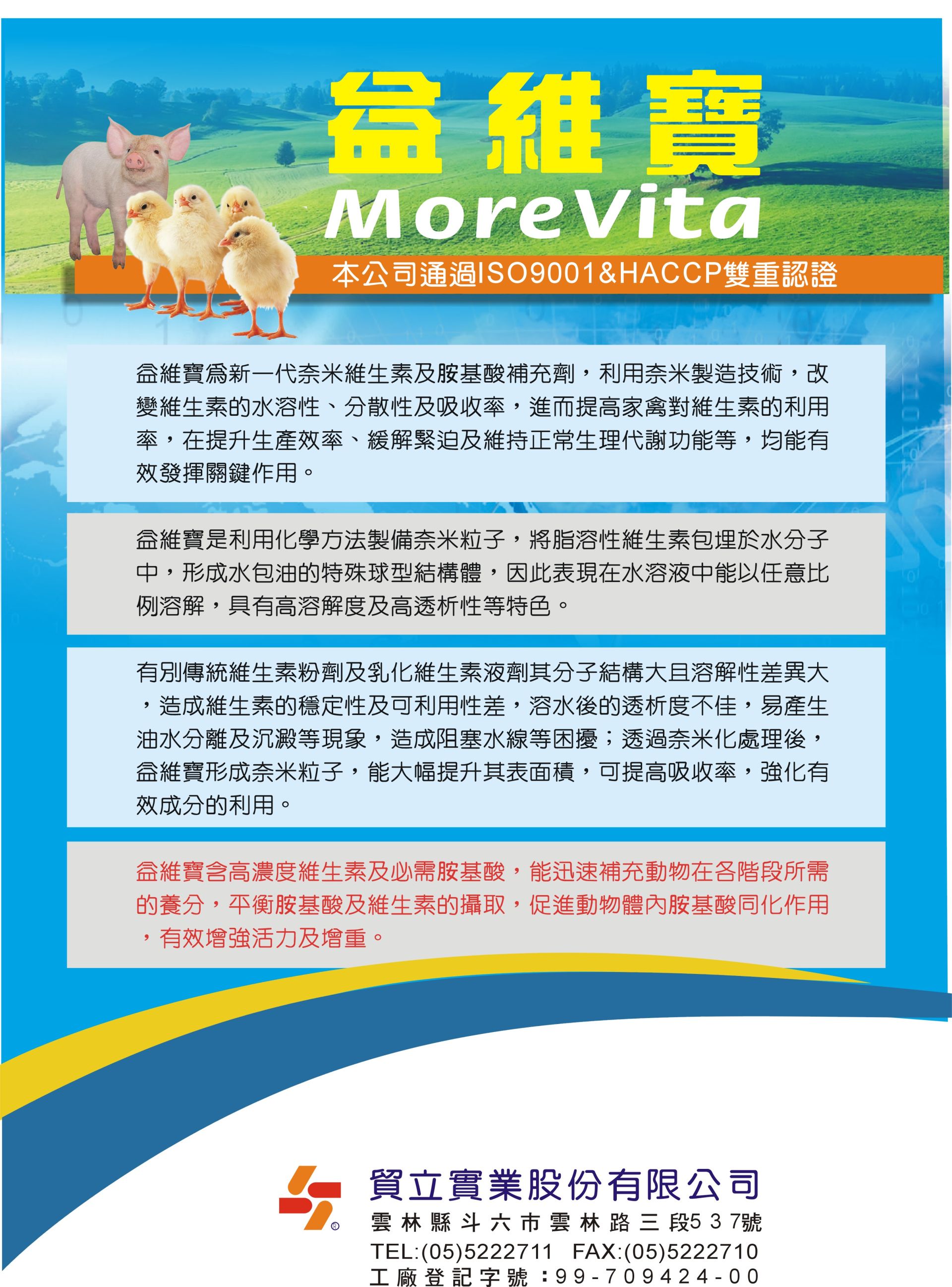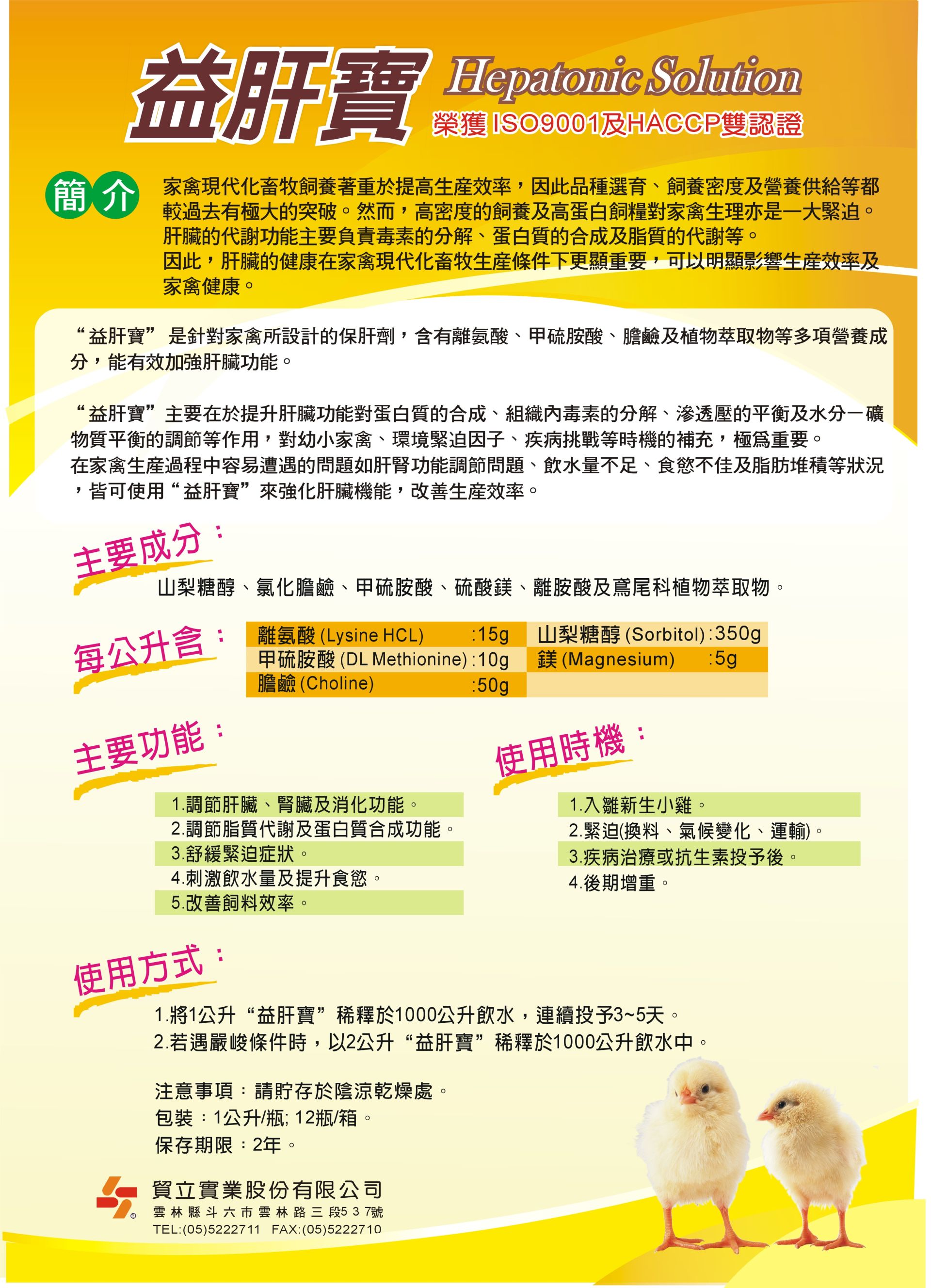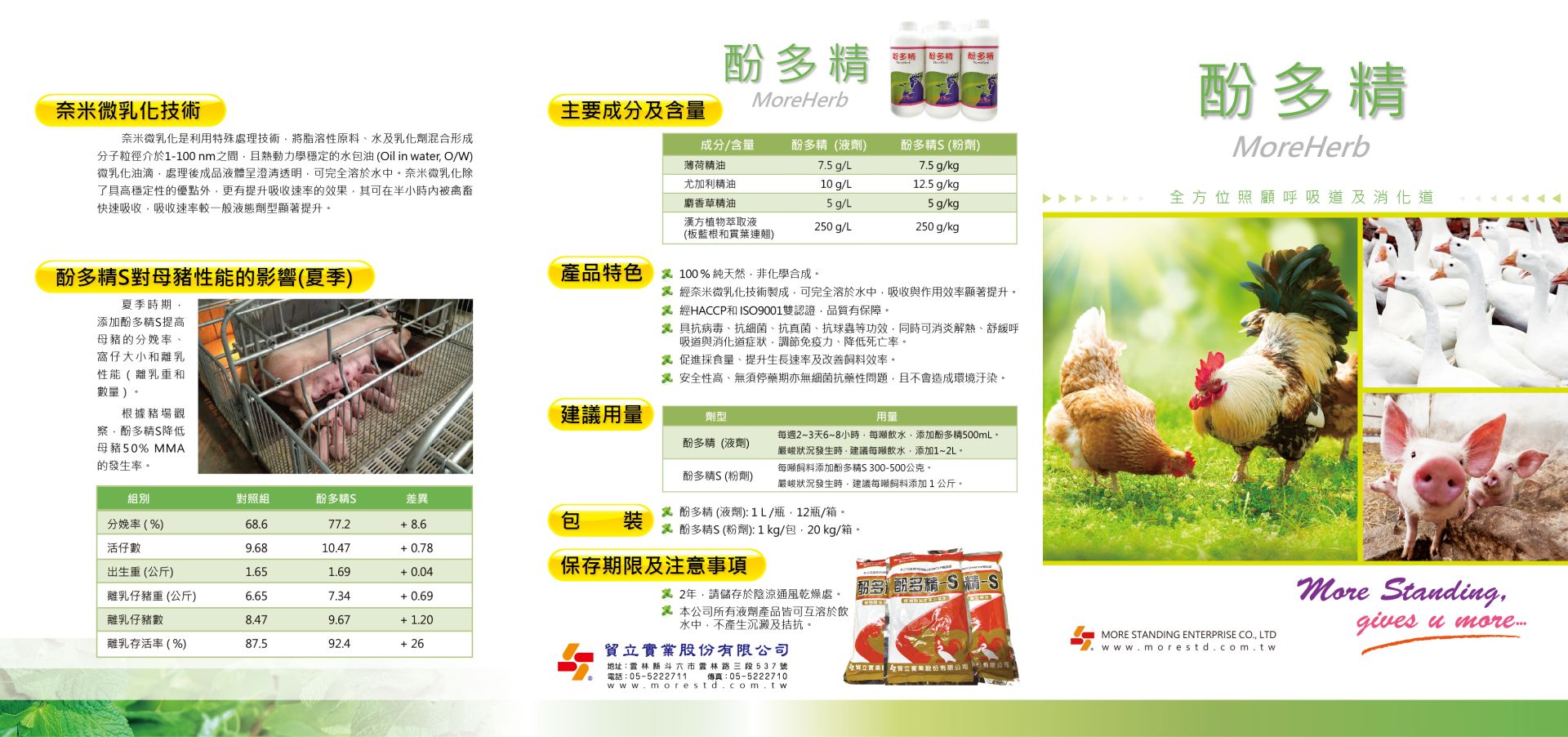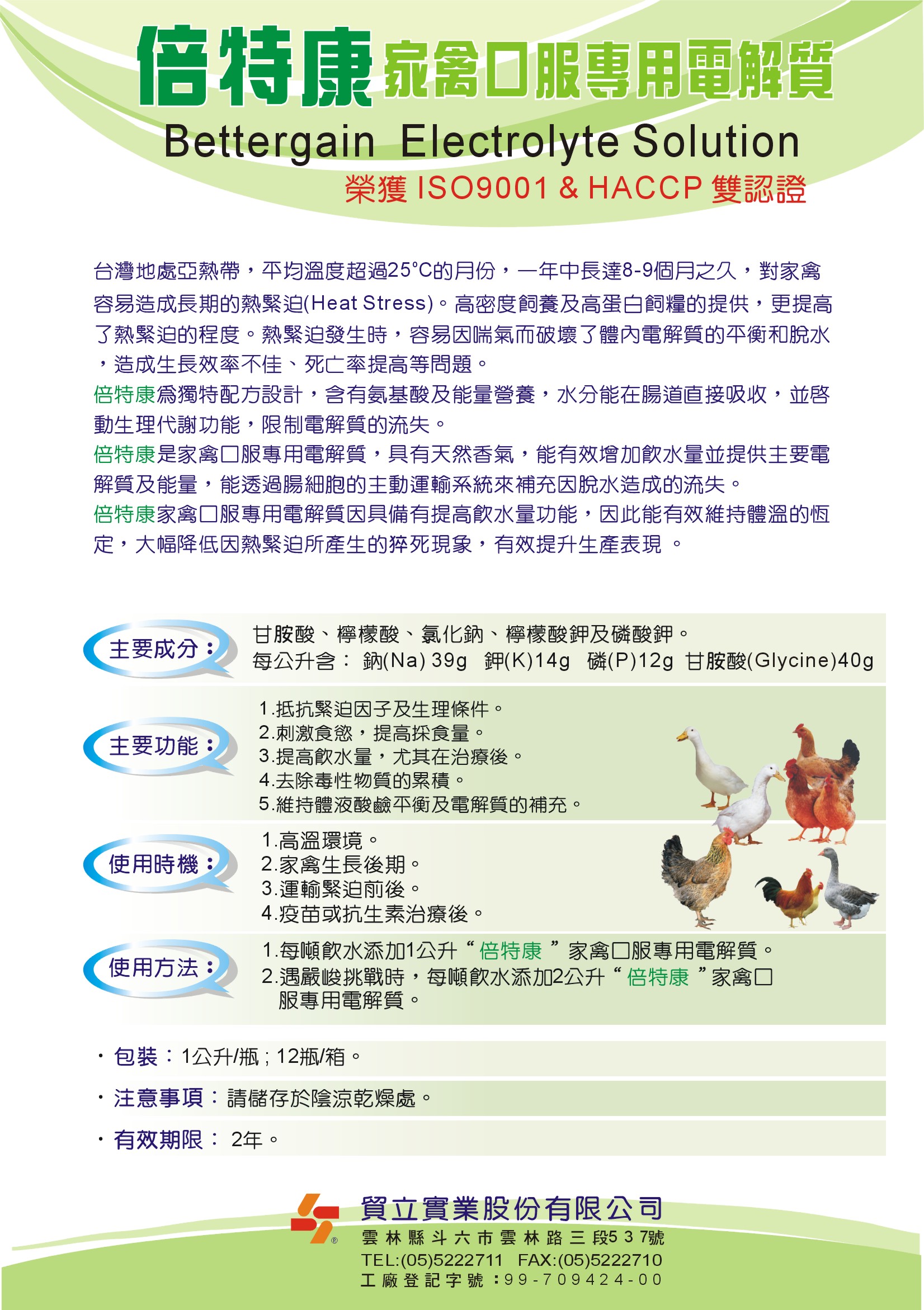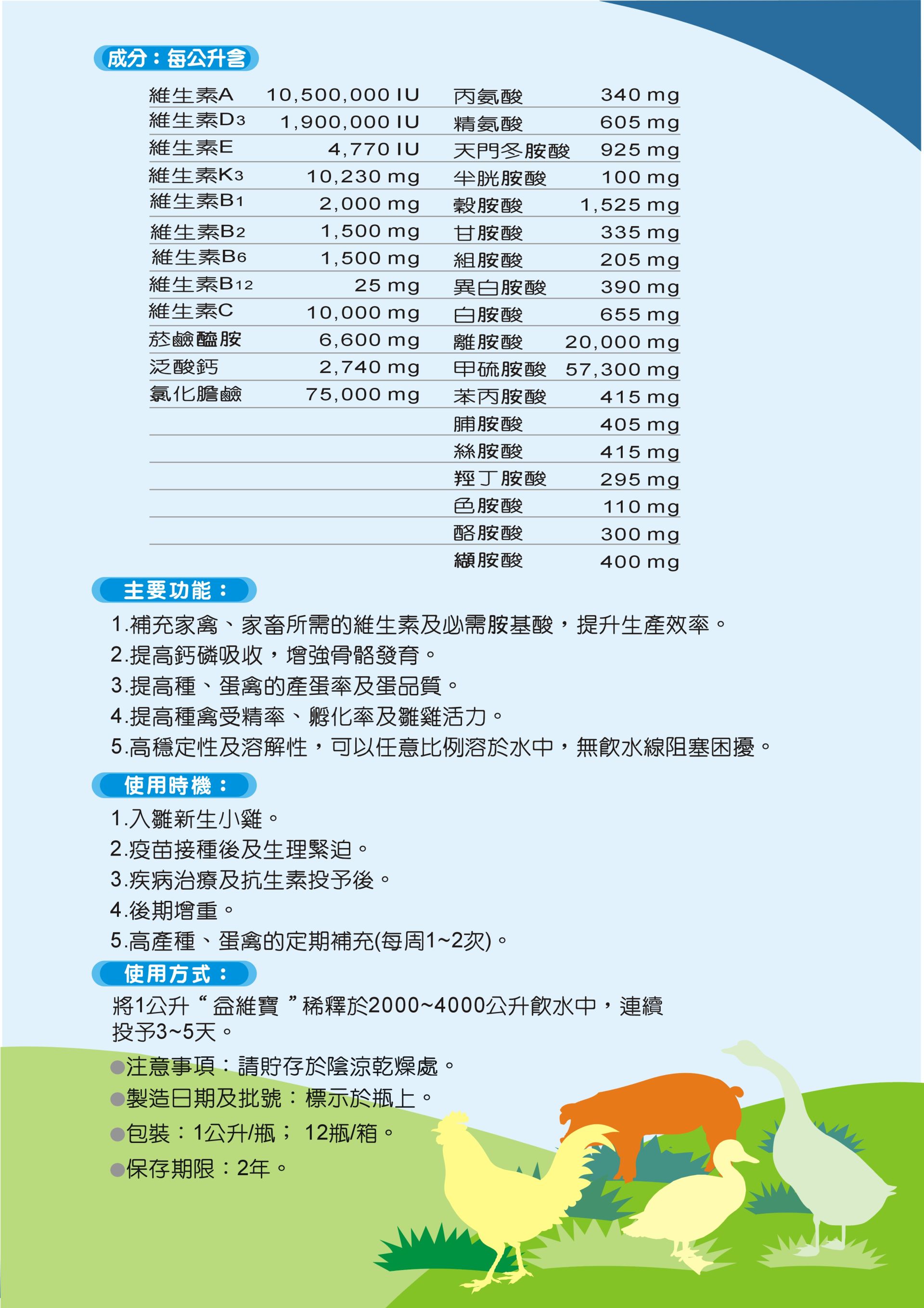 1. 酚多精含植物精油,能迅速降低發炎(消化道、呼吸道、生殖系統)和緊迫(疫苗過敏、高溫、併欄、運輸),以預防疾病並促進生長。2. 益維寶為完整維生素與胺基酸配方,可增強骨骼、提高產蛋、降低緊迫,恢復生產活力。3. 益肝寶含山梨糖醇、甜菜鹼、鎂、膽鹼和植物萃取物,可提升肝腎機能,改善脂肪和蛋白質代謝,降低毒素緊迫,刺激飲水與採食,改善飼效和增重。4.倍特康能促進飲水、快速補充電解質,降低高溫、發炎、生產緊迫,恢復生長性能表現。