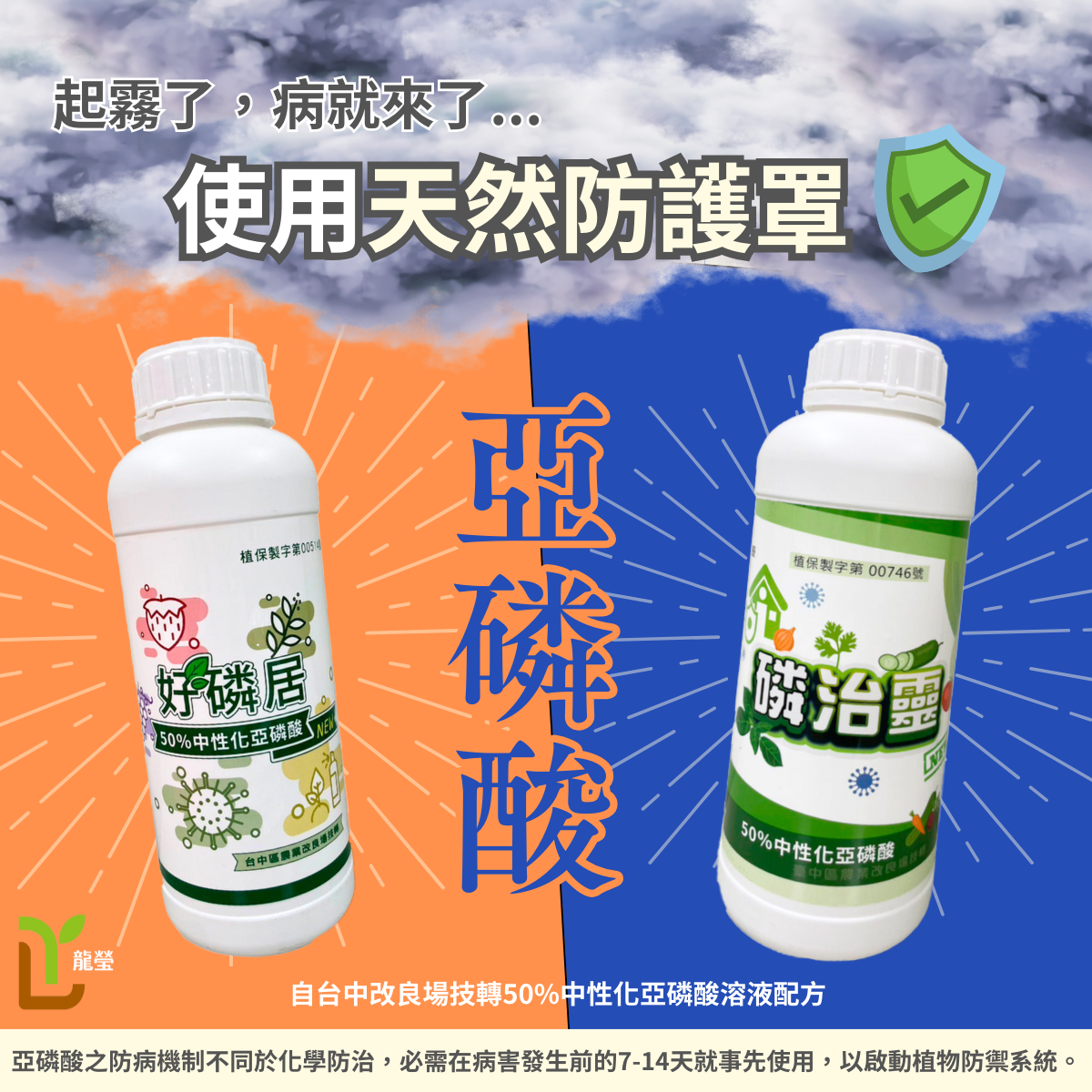 (1) 本產品為台灣農業部台中農業改良區,授權技轉之50%中性化亞磷酸溶液配方,經過試驗保證至少24個月內不會退化成磷酸。