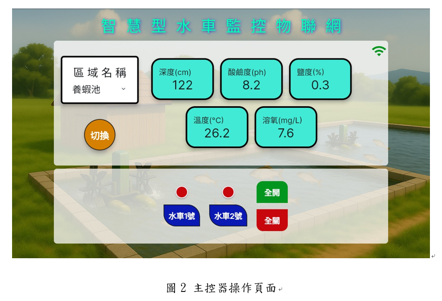 主控制器是整體系統現場的監控中心,藉由互動式的操作介面,1.直接控制個別水車控制、個別養殖池水車控制、及單一按鈕,啟閉全部水域水車,節省操作時間。此外透過按鈕,可以直接查詢各監看水域的水質數據,及影像,再依此進行適當的系統操作控制。整體操作畫面,如圖3