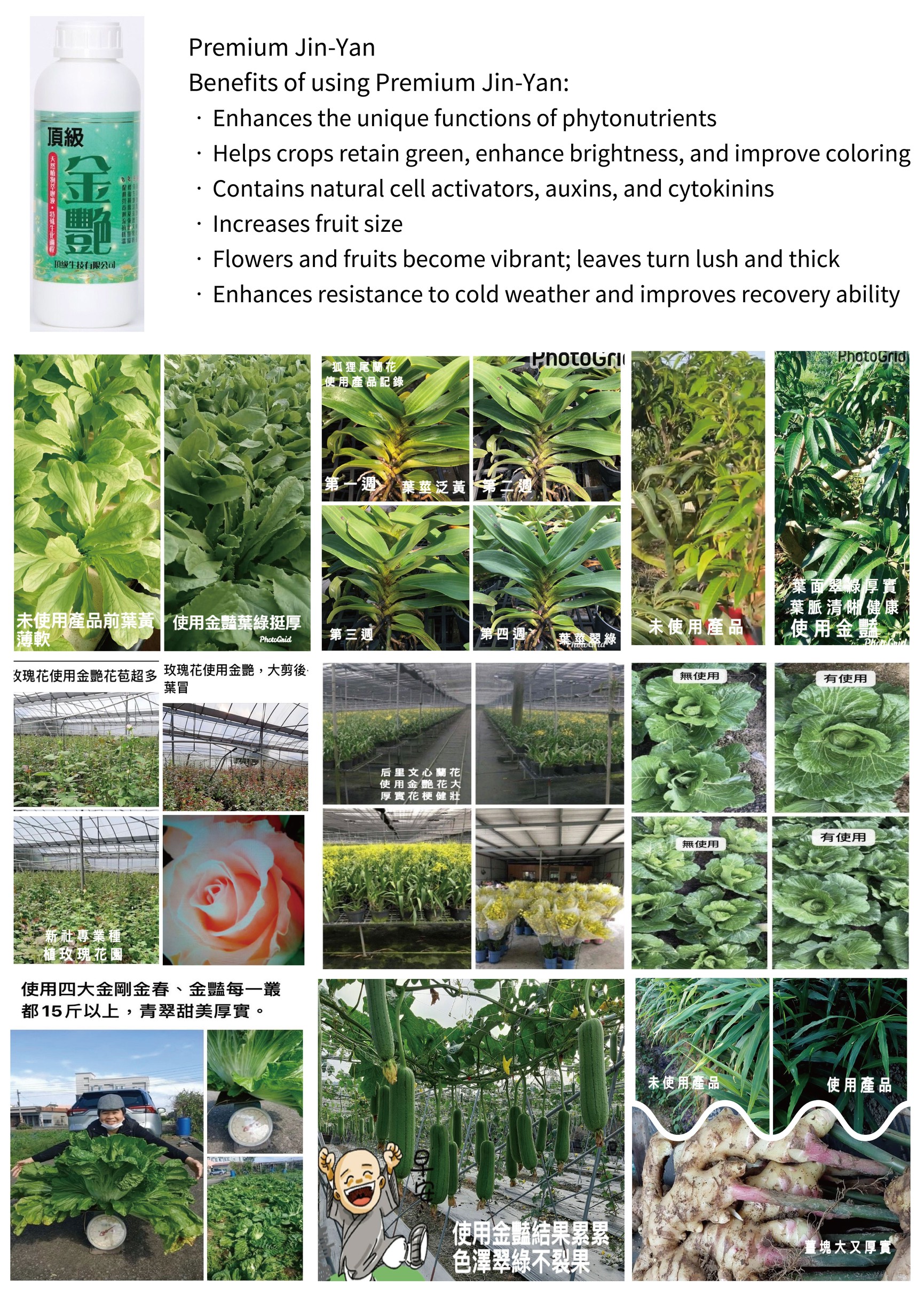 Jin-Yan enhances plant carbon assimilation and photosynthetic efficiency with excellent nitrogen transformation and color-enhancing properties. It promotes anthocyanin and phytochemical synthesis, resulting in thicker, vibrant green leaves and larger, richly colored fruits. Ideal for early growth, flowering, fruit initiation, and coloration stages, it is especially effective in stabilizing plant growth and improving quality under stress conditions such as cold or heat waves.