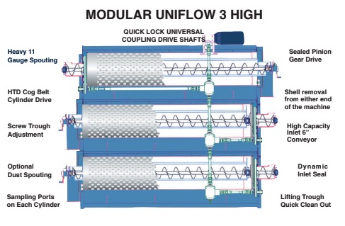 UniFlow 是全球農產加工領域公認的標準長度分級設備,採用內壁帶有凹槽的旋轉筒,藉由離心力將短顆粒分離,並透過重力與可調式分離槽精確控制分級程度。