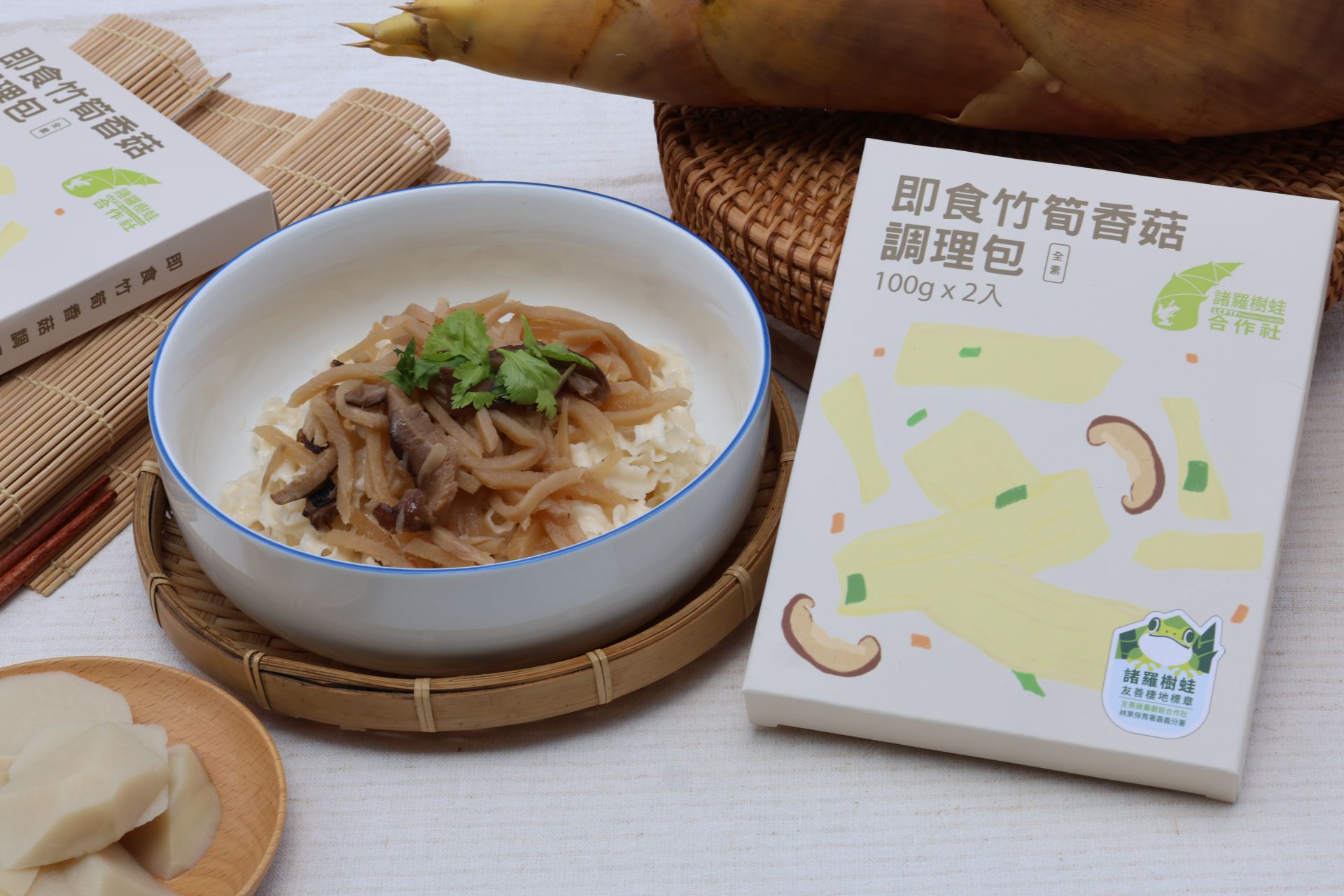 「即食竹筍香菇調理包」由諸羅樹蛙合作社用心製作,採用友善農法栽種的鮮甜竹筍與嚴選香菇,低油清爽,呈現食材最自然的風味。無論是忙碌上班族的快速料理,或是家庭餐桌的配菜佳餚,只需拆袋即可享受一份兼顧健康、美味與便利的好滋味。選擇這份調理包,不僅是支持在地農民,也是一同守護台灣特有種諸羅樹蛙與永續環境的行動。