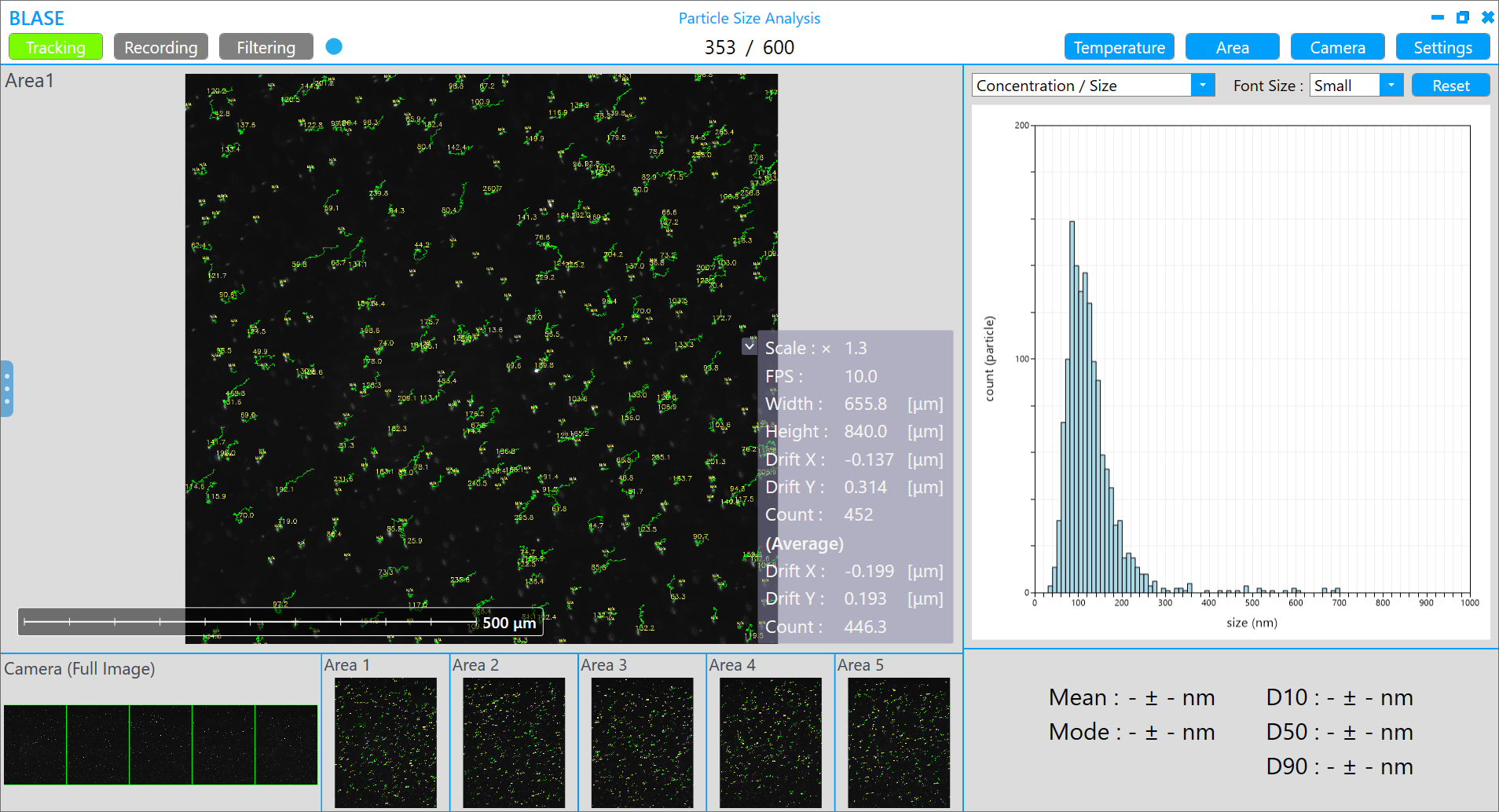 透過追蹤布朗運動並應用 Stokes–Einstein equation(史托克-愛因斯坦方程式)計算粒徑。BLASE 藉由分割視場進行並行處理,能在約 2 分鐘內完成粒徑分析。