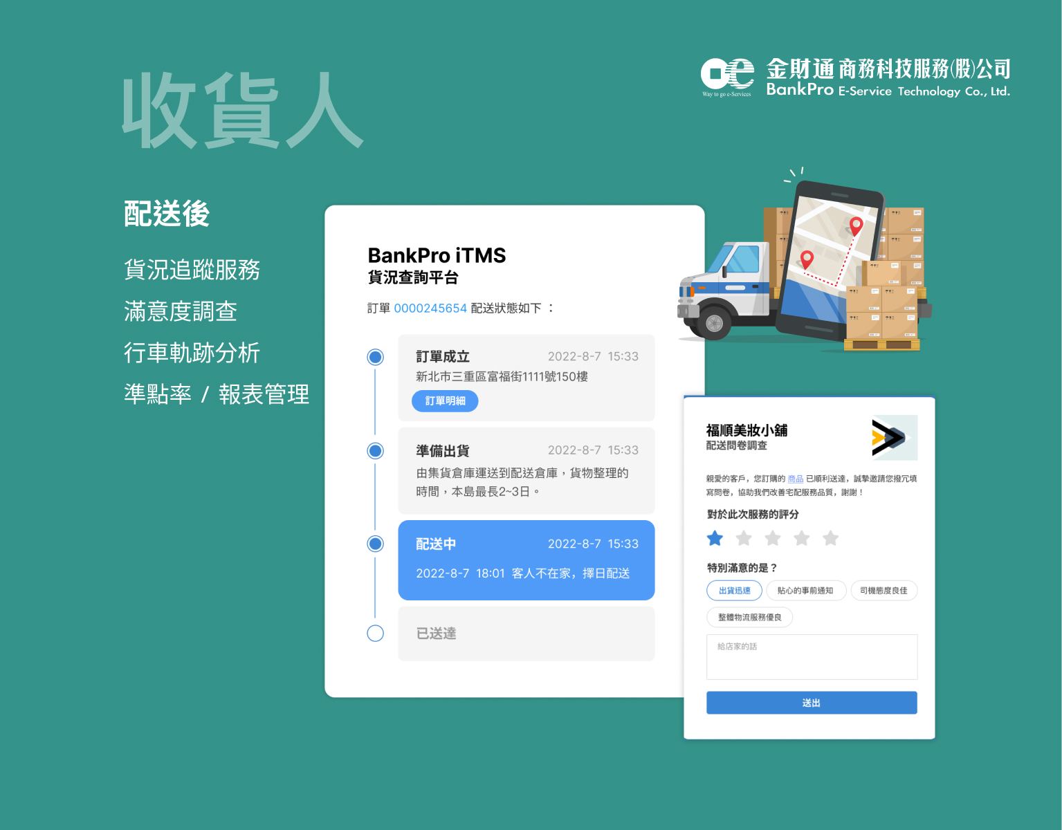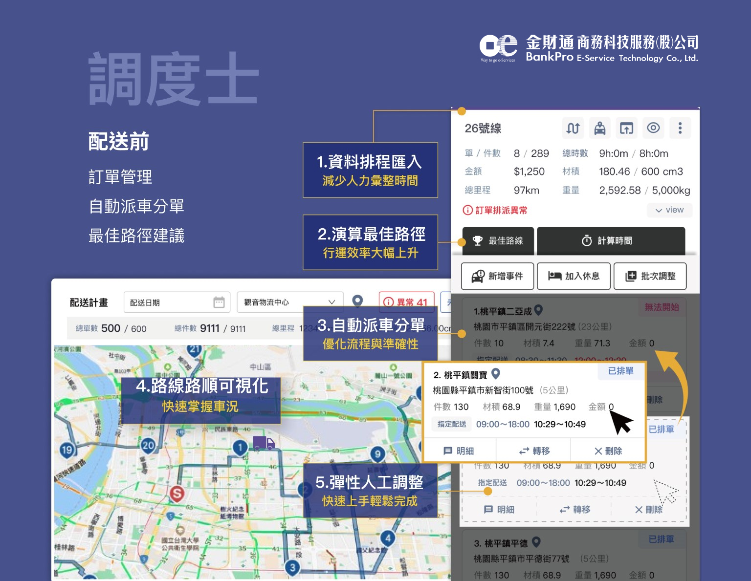 調度士可輕鬆管理的視覺化派車界面,透過路線路順智慧演算,跨系統整合多渠道訂單資料,有效解決(1) 紙本作業的混亂流程 (2)派車僅憑調度士的經驗。 而為物流士打造的專屬APP,清晰顯示每日配送資訊與路線,並加入車檢、點檢功能輔助,協助物流士在安全健康的環境中,無誤地展開每一日的工作!