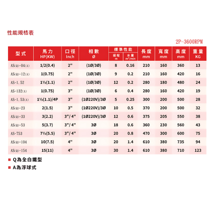 4. The motor body and main shaft of this series of pumps are made of stainless steel material; SIC mechanical wear-resistant shaft seals are used for the shaft seals. ※ Float switches can be optionally installed for pumps with 2HP and below. ※ An optional detachable device can be installed to facilitate hanging and removal of the pump, making it easy to match pipe diameters and facilitating inspection and maintenance operations.