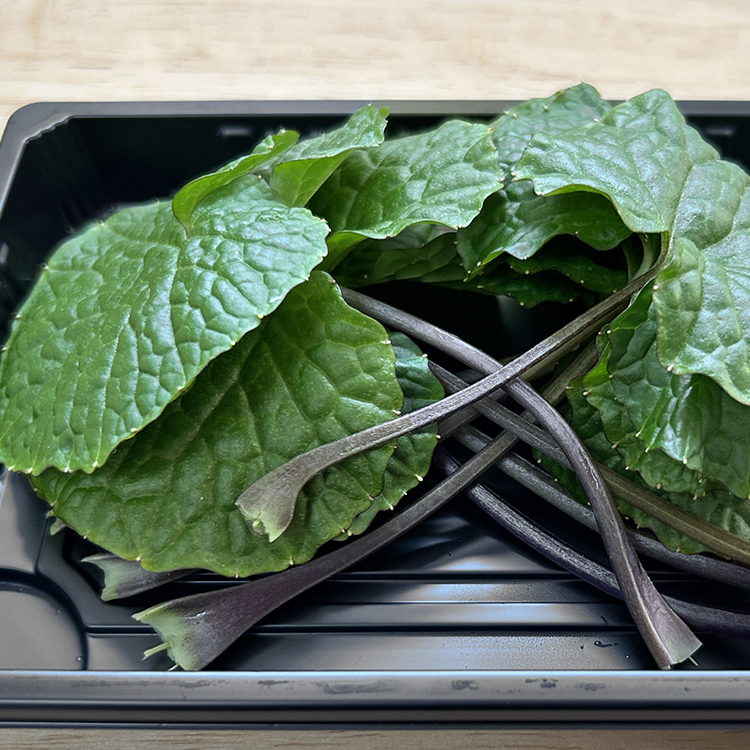 Like the root, wasabi leaves are both spicy and fragrant. Spring is the peak season for wasabi leaves. This high-value crop requires very stringent growing conditions and has antibacterial and digestive benefits. They can be cooked with soy sauce as a side dish for rice or alcohol, or even coated in batter and fried as tempura.