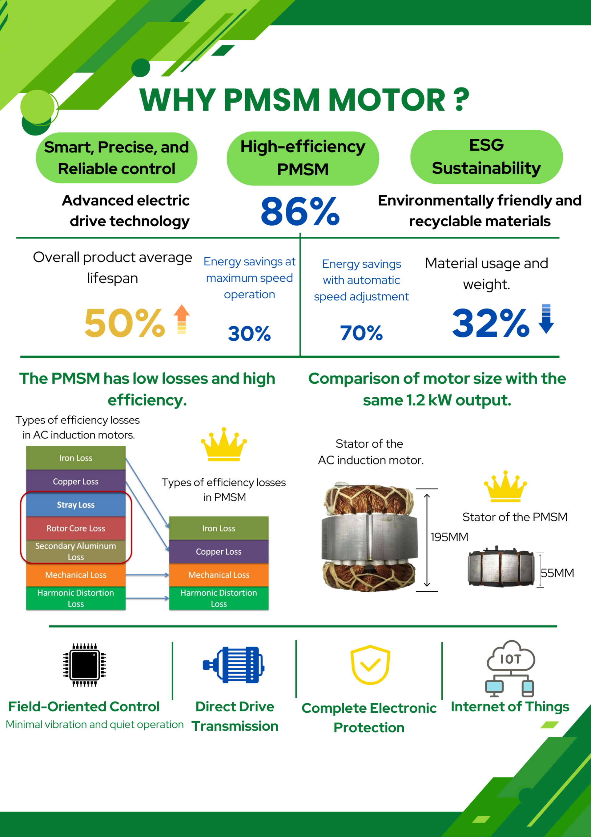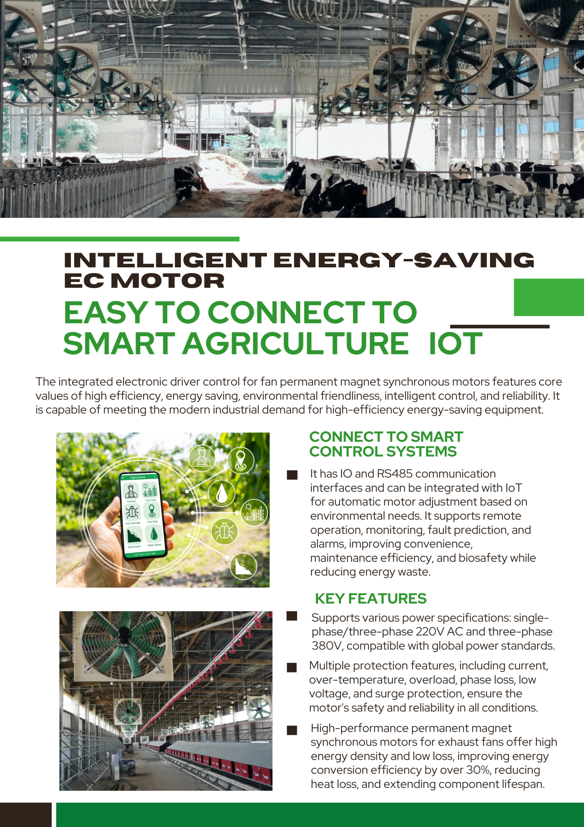 The fan permanent magnet synchronous motor with integrated electronic driver features high efficiency and energy-saving, eco-friendliness, intelligent control, and reliability and durability as its core values, meeting the modern industry's demand for high-efficiency and energy-saving equipment.