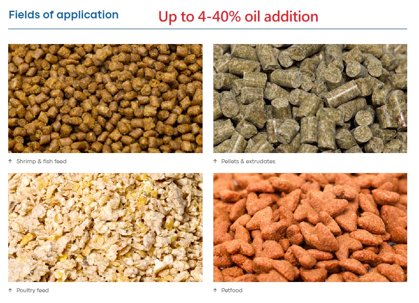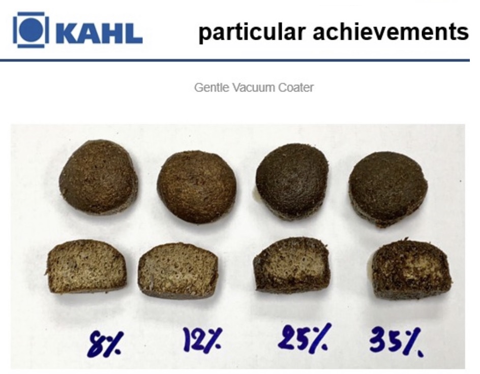 The German KAHL Vacuum Coater applies up to 4–40% oil to pellets in a gentle manner. In contrast to conventional systems, it features a vacuum pump, highly sealed scrapper valve, and an internal drum mixing design that reduces secondary breakage, making it widely applicable for oil coating of pet food and aquafeed.