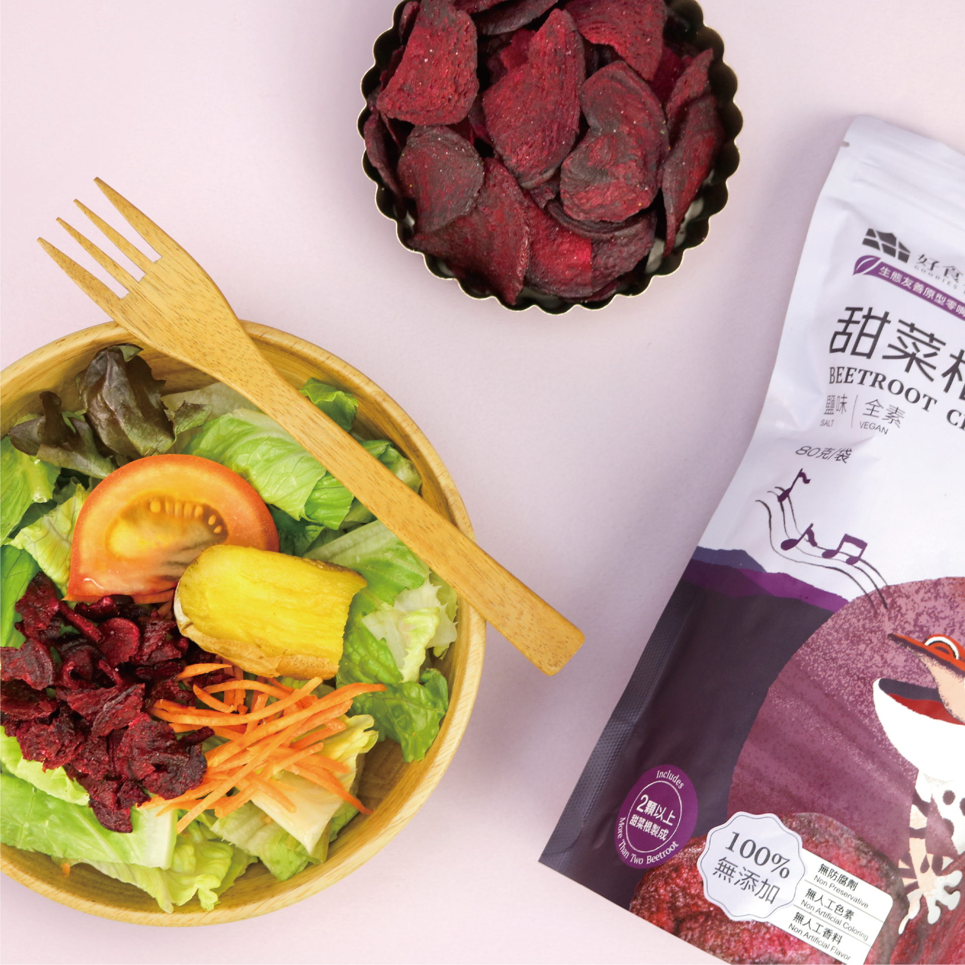 Carefully selected beets grown with non-toxic farming methods in Yunlin, paired with non-GMO canola oil. Through low-temperature vacuum frying, we preserve the natural aroma and flavor of the ingredients, creating a crispy and satisfying snack.