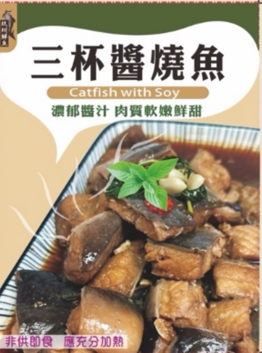 「三杯」是指一杯醬油、一杯米酒、一杯麻油,再加入大量的蒜頭、薑片與九層塔,炒出濃郁香氣後將魚燒煮入味。鯰魚肉細緻嫩口,吸附了醬汁後鹹中帶甜、香而不膩。鯰魚丁採用手工去骨安心吃,肉質細緻無腥味。