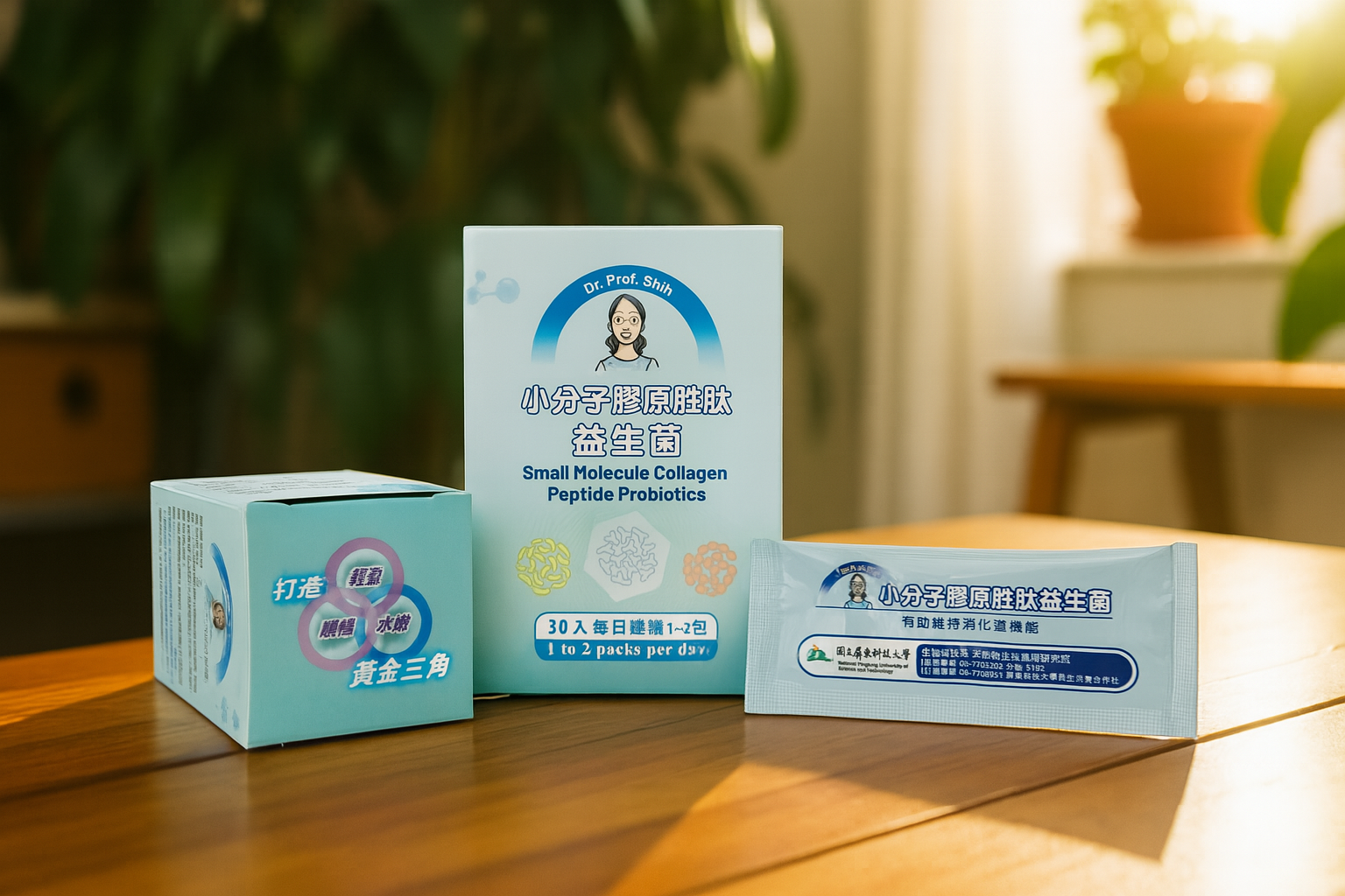 The Small-Molecule Collagen Peptide Probiotic is a commercial health supplement that combines probiotics with collagen peptides. Developed by National Pingtung University of Science and Technology (NPUST) and manufactured by a contracted food factory, the product is produced in compliance with NSF-GMP certification standards and has been available at the NPUST Student and Staff Consumer Cooperative since December 2021.