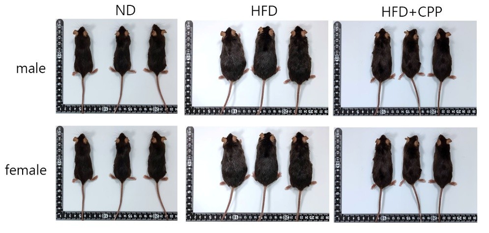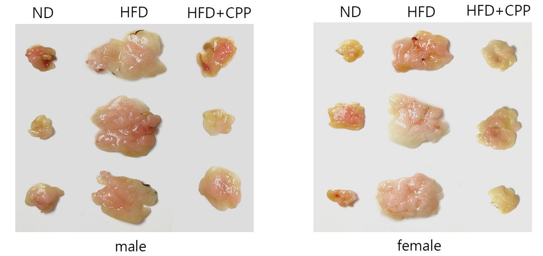 Figure 2 shows the images of epididymal fat in male mice and peri-ovarian fat in female mice at the end of the 15-week experiment, with three individuals from each group displayed.