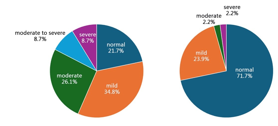 The results of the trial showed that before the intervention, among all participants, 10 were classified as normal, accounting for 21.7%; 16 as mild, accounting for 34.8%; 12 as moderate, accounting for 26.1%; 4 as moderate-to-severe, accounting for 8.7%; and 4 as severe, accounting for 8.7% (Figure 3, left). After the intervention, 33 participants were classified as normal, accounting for 71.7%; 11 as mild, accounting for 23.9%; 1 as moderate, accounting for 2.2%; 0 as moderate-to-severe, accounting for 0%; and 1 as severe, accounting for 2.2% (Figure 3, right).