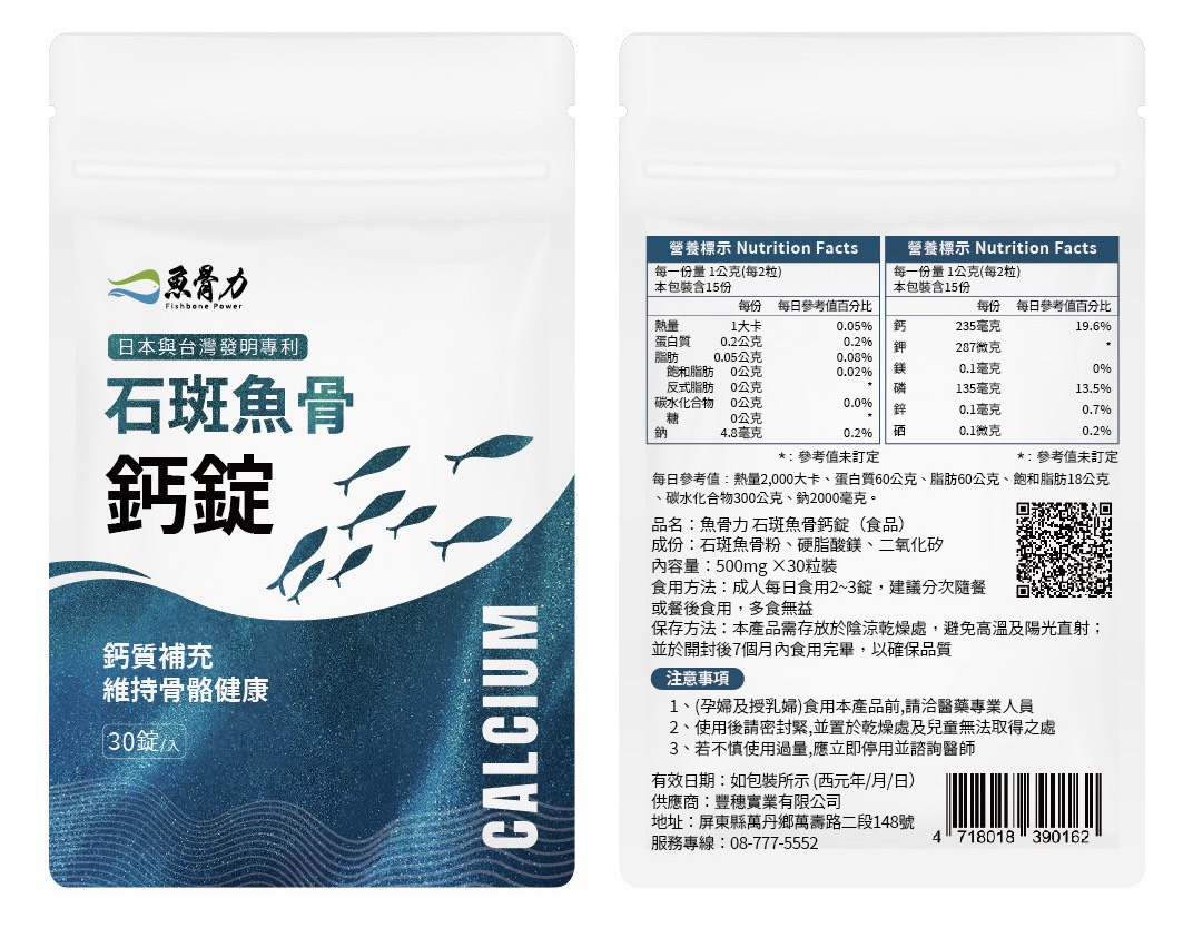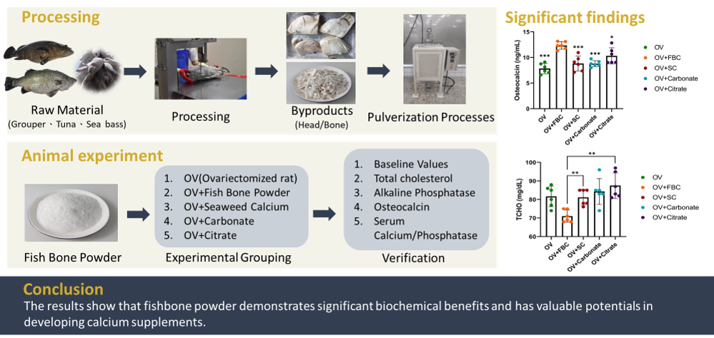 Commercialization of Precision Health By-productsUsing fish heads and bones as raw materials, health supplements are developed that are natural, free from side effects, and rich in nutrients essential to the human body such as calcium, potassium, magnesium, phosphorus, zinc, and selenium. The calcium-to-phosphorus ratio is approximately 2:1, which best supports human bone structure. In accordance with the Ministry of Health and Welfare’s evaluation method for the bone health efficacy of functional foods, a 12-week animal study was conducted using ovariectomized mice. The results showed that fish bone powder effectively increases osteocalcin levels and reduces cholesterol and triglycerides. Compared to other natural or synthetic calcium sources, it demonstrated significantly better bone health benefits. Through the concept of circular reuse, this approach not only enhances the added value of aquatic processing by-products but also promotes overall industry sustainability.