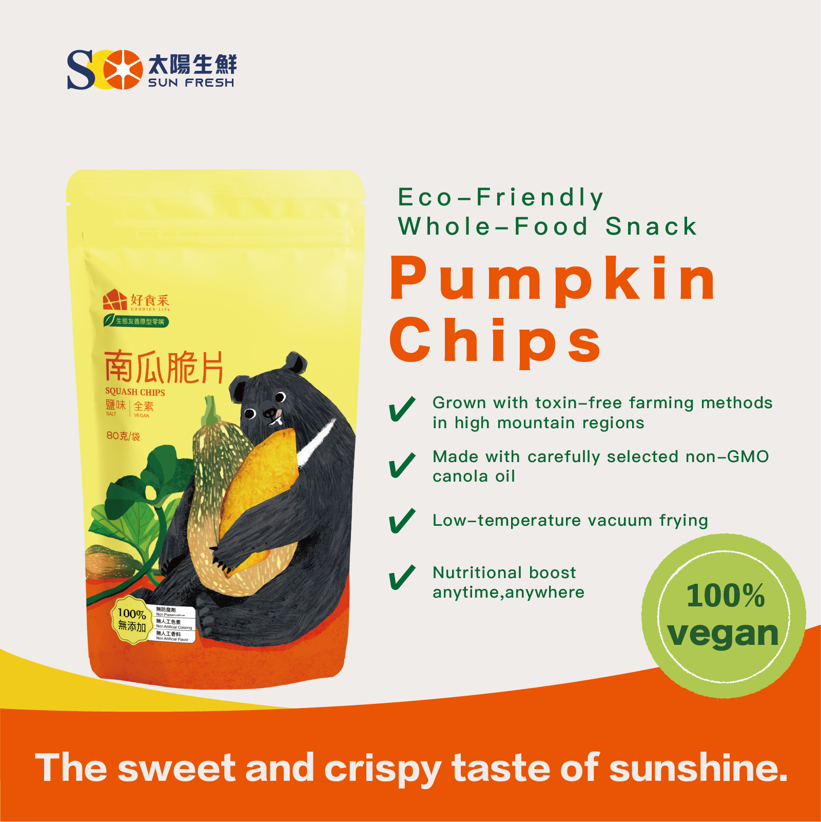 Carefully selected A-Cheng Pumpkin grown with non-toxic farming methods in Yunlin, paired with non-GMO canola oil. Through low-temperature vacuum frying, we preserve the natural aroma and flavor of the ingredients, creating a crispy and satisfying snack.