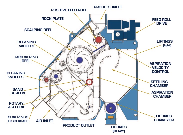 The Scalperator series is available in 11-, 24-, and 48-inch models, capable of performing coarse screening and aspiration simultaneously. Its patented polyurethane feed roll and adjustable air system ensure consistent feeding and uniform cleaning performance. Operators can fine-tune parameters through inspection windows and control valves, improving process consistency and repeatability.