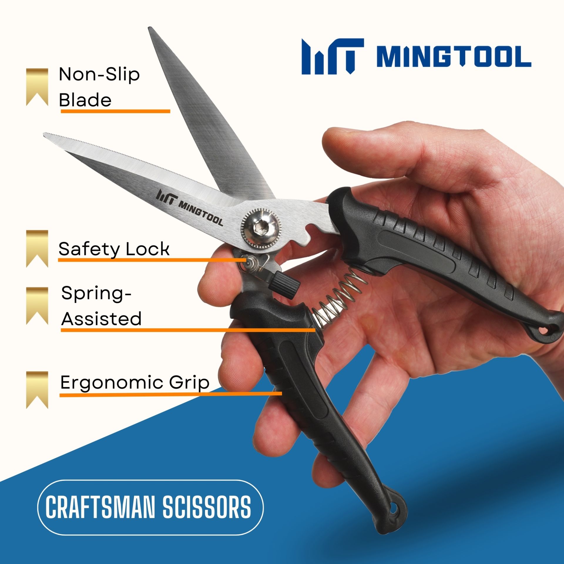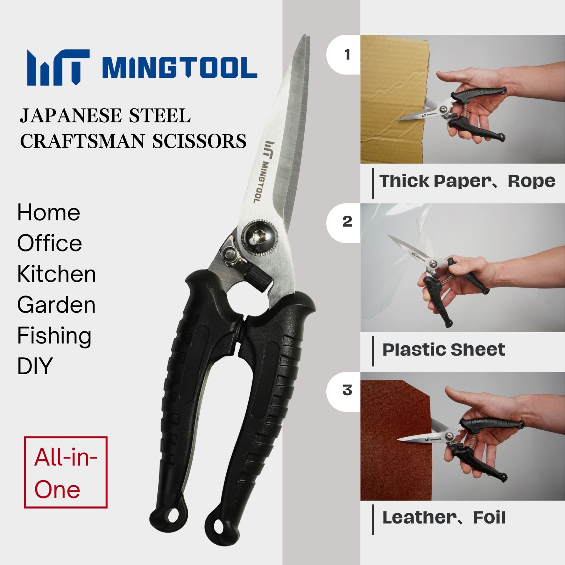 This is a heavy-duty industrial scissors engineered for rigorous tasks, featuring thickened 4.0mm Japan stainless steel blades. Its key feature is the serrated blade edges, which effectively prevent objects from slipping during the cutting of tough materials. The anti-impact ergonomic handles ensure a comfortable grip even during long-term high-intensity operations, and it is assembled with adjustable screws to maintain consistent cutting performance.