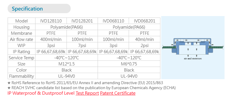 The product combines the highly micro-porous PTFE membrane and injection plastics, which is specially designed for the electronics and electric devices exposed outdoors. It is mainly used to prevent the moisture, dust and other chemical crystals from entering the electronics and electric devices. Moreover, it applies the highly micro-porous characteristics of PTFE to discharge the pressure generated by the moisture and the excessive heat, so as to prevent the overlarge internal pressure aggregation to damage the sealing housing and internal electronic components. In this way, it can extend the service life of the devices.