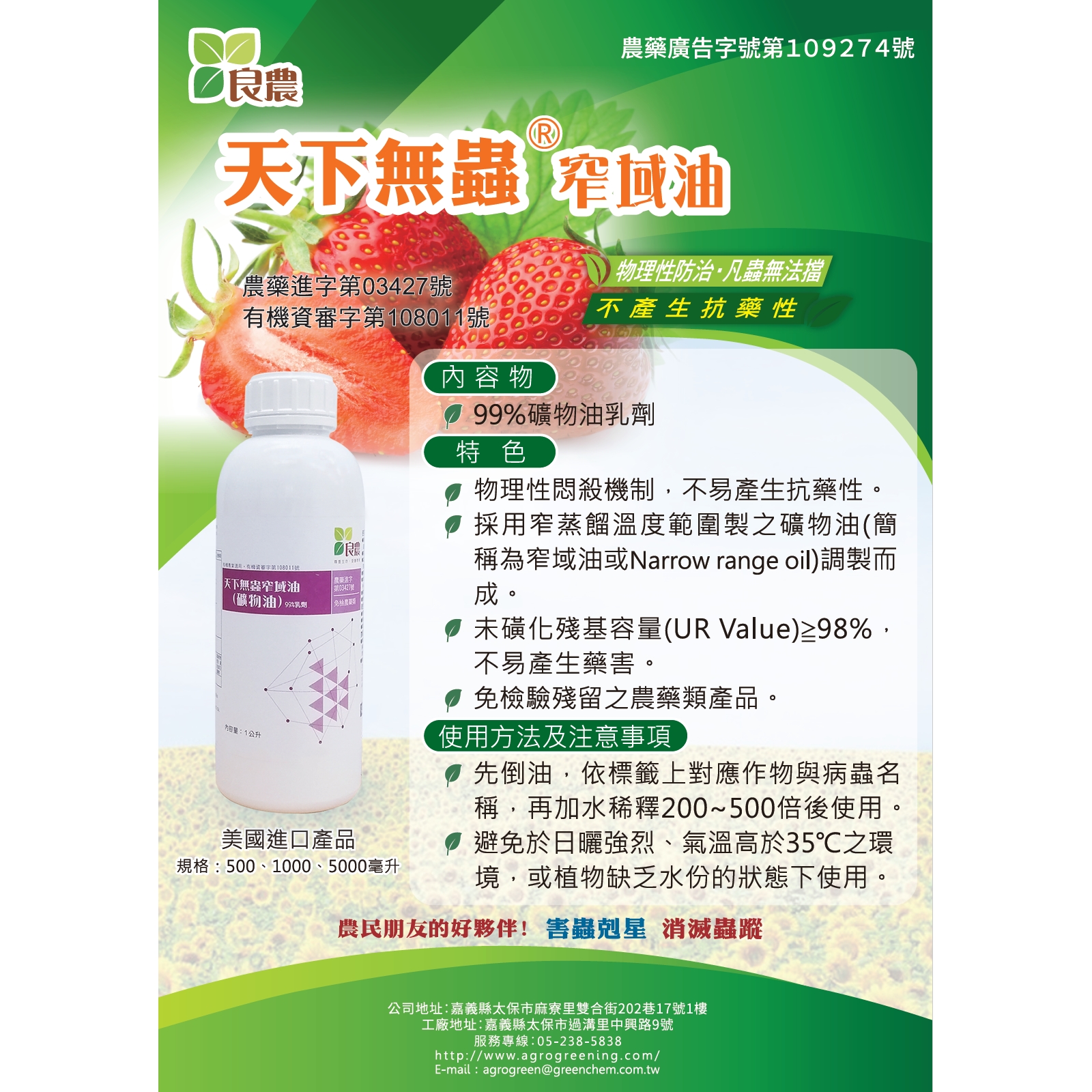 窄域:礦物油的碳鏈數介於18~40,被稱為廣域油。為了農用礦物油的防治效果和安全性,碳鏈數建議值介於21~24。本產品90%碳鏈數介於21~24,平均23,所以被稱為窄域油。