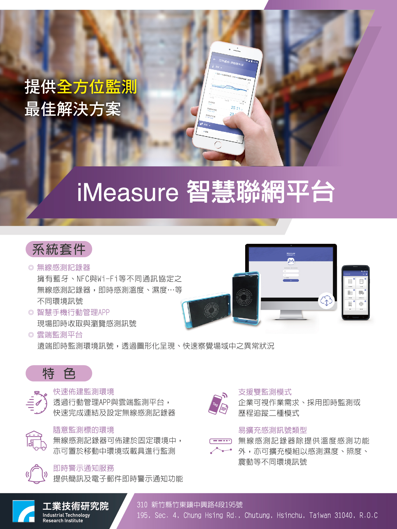 此方案應用溫溼度感測器偵測與收集濕度及溫度資訊,再透過智慧監控 APP 傳送至監管平台,發現異常溫度資料可即時透過 Line 與 E-Mail 方式通知管理人員,以立即處理失溫的問題,協助倉儲與物流業者提供全程不斷鏈的物流服務。
