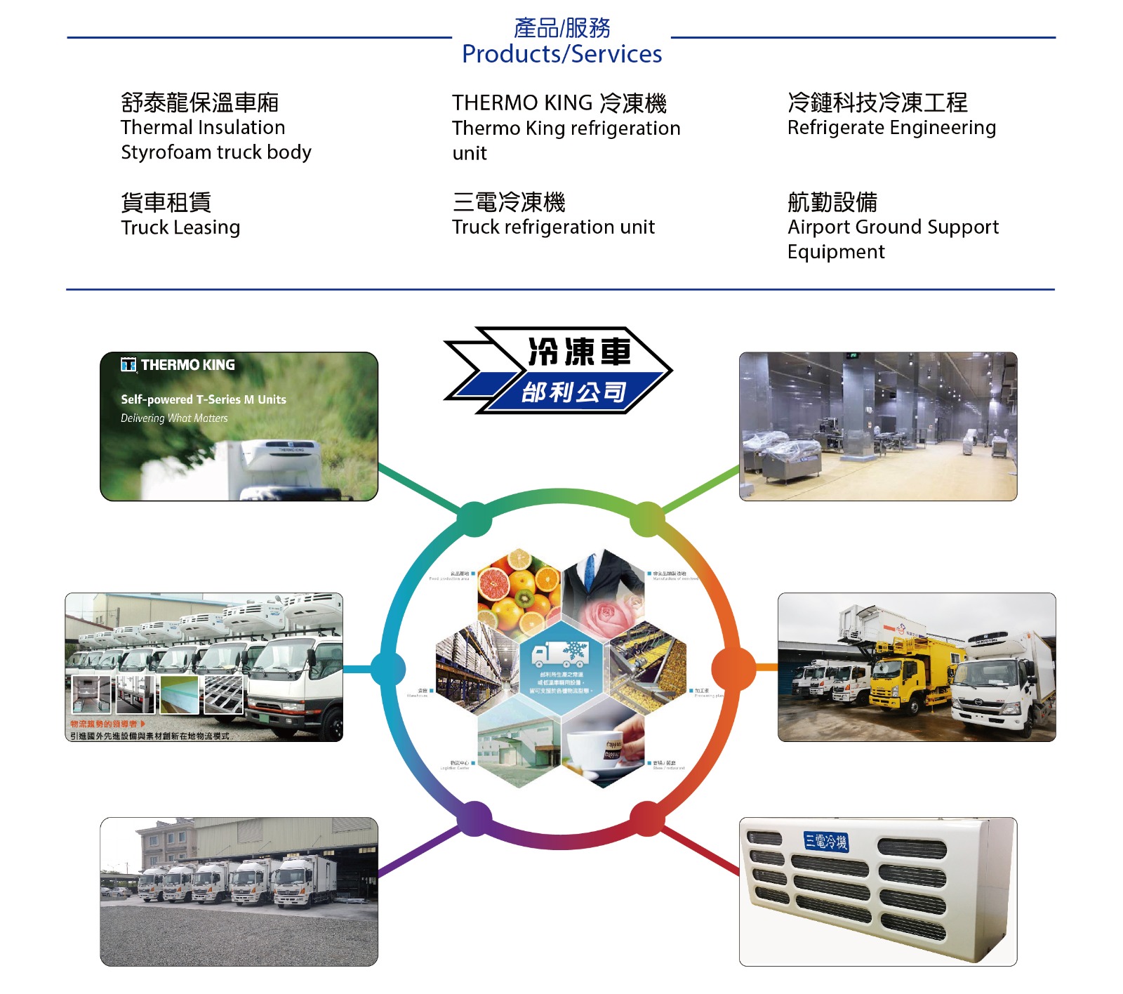 邰利產品包含各式常溫冷凍冷藏設備,自大小貨車及尾門選擇建議,至邰利車廂和冷凍機組的客製化設計製造銷售,以及售後保養維修等一條龍服務客戶。