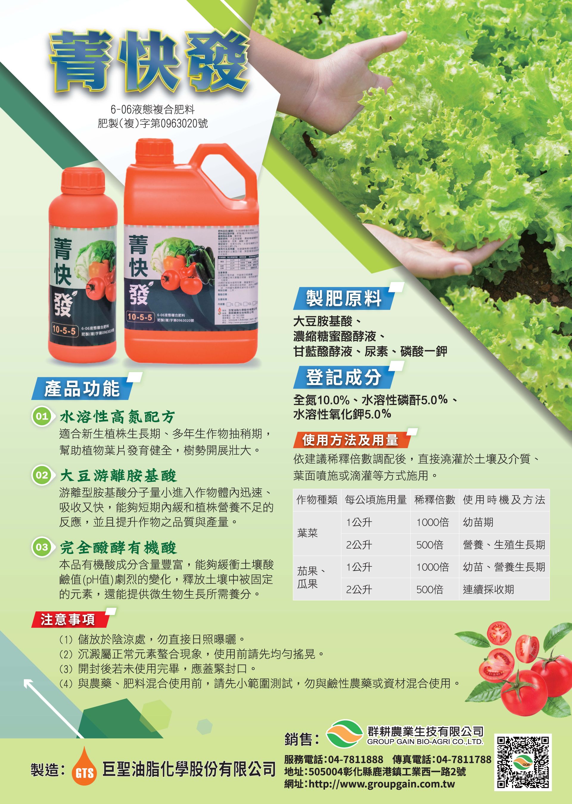 群耕–菁快發採用水溶性高氮配方,特別適合新生植株生長期及多年生作物抽稍期,幫助植物葉片發育健全,樹勢開展壯大。富含植物來源胺基酸,快速被作物吸收,有效緩解營養不足,提升作物品質與產量。完全醱酵有機酸成分豐富,能緩衝土壤酸鹼值變化,釋放土壤中被固定的元素,提供微生物生長所需養分。選擇群耕–菁快發,讓您的作物健康茁壯成長!