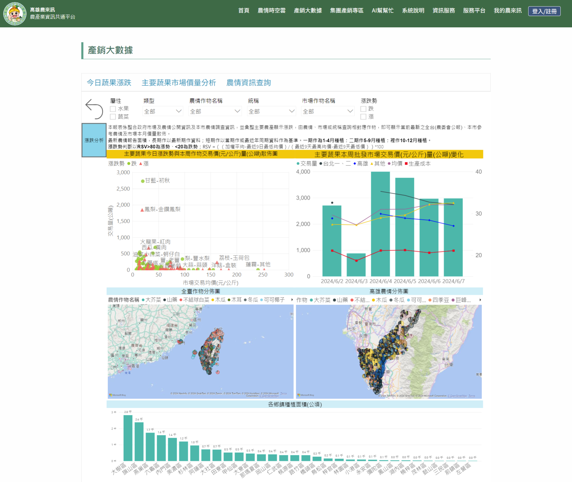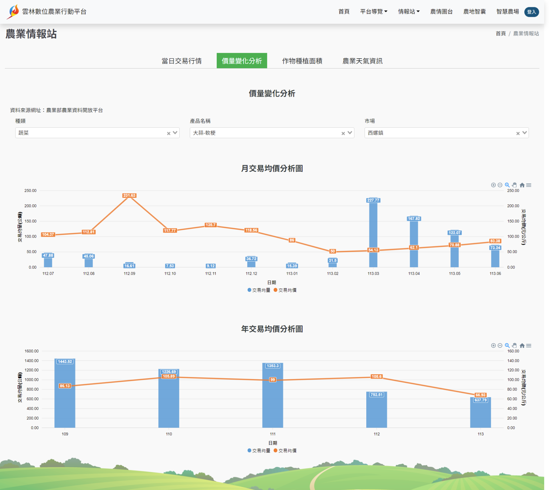 建置資料與圖資整合管理方式整合市場、農情公開資訊及縣府自有農情調查資訊,並彙整主要農、漁、畜產資訊開發相關分析圖表進行系統開發;當發生產銷失衡風險時可以交叉分析篩選作物類型、農情名稱、統稱或市場作物名稱,快速檢視各試圖表呈現作物交易量、價量、歷史數據及交易量進行分析與判釋,以提早因應產銷失衡之風險。
