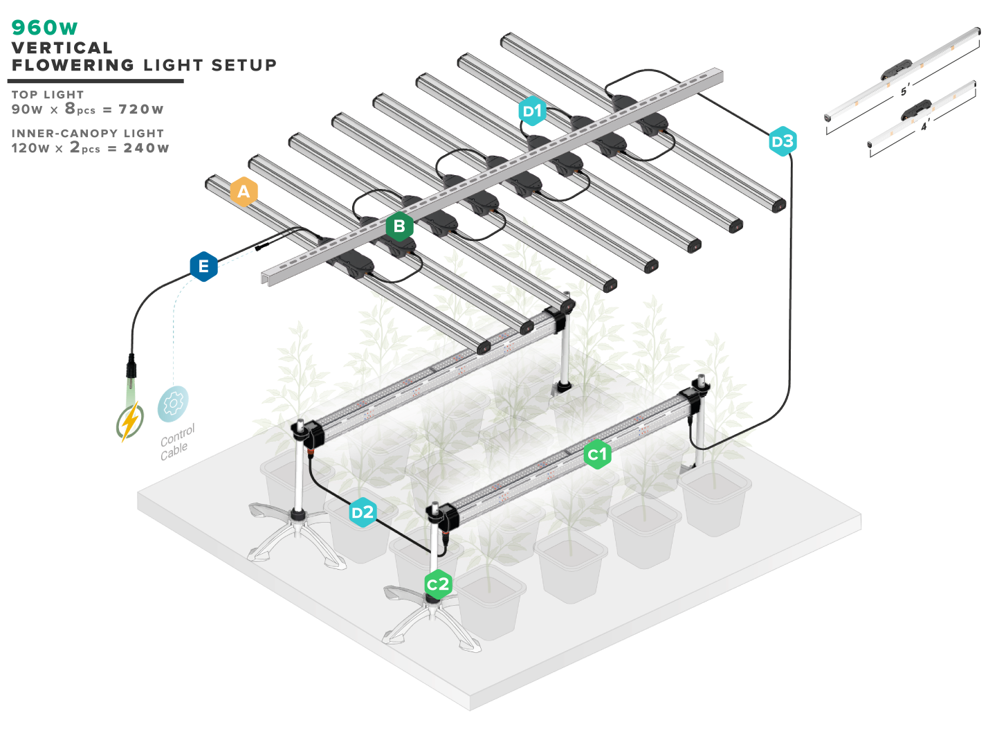 Model One 系統能夠提供完全的靈活性和控制,其中電源線方面也有多種選擇,以滿足各種種植者的需求。例如二合一的電源線、不同長度的菊花鏈線等,能夠切合不同模組需求,輕鬆建立和套用客製化的照明系統,使種植者在空間上和客製照明上獲得最大的自由度和靈活性。