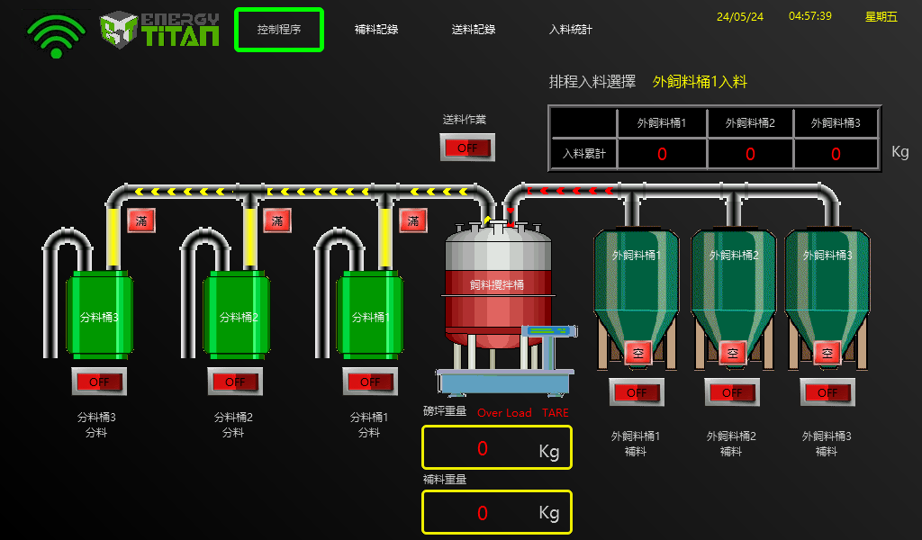 針對台灣畜禽飼料輸送配置系統開發,可全程自動控制或與原生系統半控制,並可依據您的配置及需求決定最適合的方式。整合用戶之外飼料、攪拌桶、磅秤、各分料站之數位感測器偵測,進行進料時間、重量、分區分料統計。根據用戶需求的情況和要求,可編程不同自動控制進料、混料選項及統計。精準掌握各餵飼區站進料及餵飼量數值紀錄及提供完整報表以對應生長混合曲線。