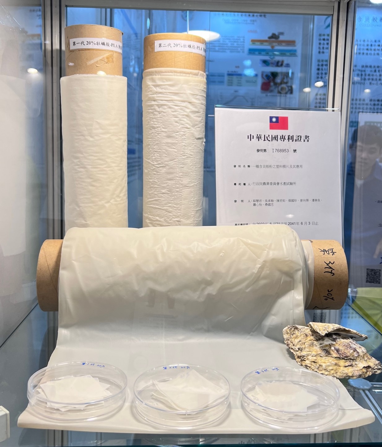 以牡蠣殼粉為原料,經改質技術與生物可分解塑膠混合後製成牡蠣殼生物可分解薄膜,其具有優異抗菌性、可降解性以及特殊機械性能,可應用於食品等包裝材料。