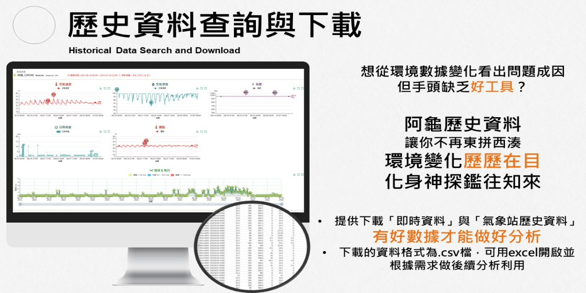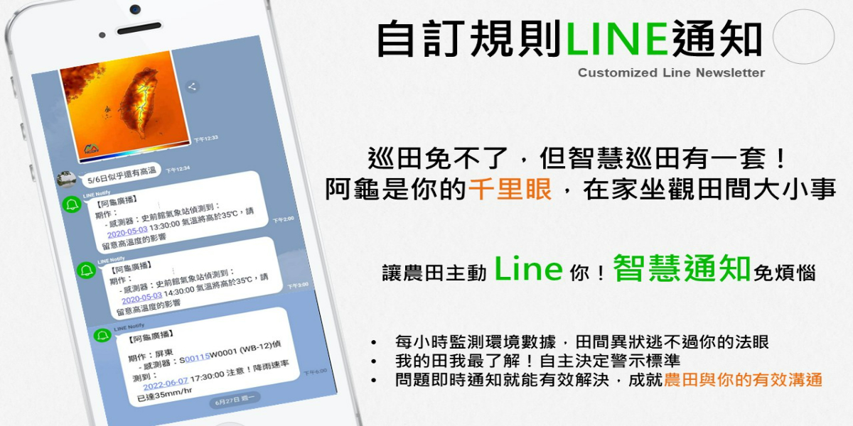 串聯阿龜微氣候軟體平台,提供即時數據呈現、歷史資料下載與環境數據月報,符合使用者的各種種植或是研究數據需求。亦可於系統內自訂警示閾值,並連結LINE帳號,系統將於每小時檢查環境數據,並於設定之條件滿足時發送通知。
