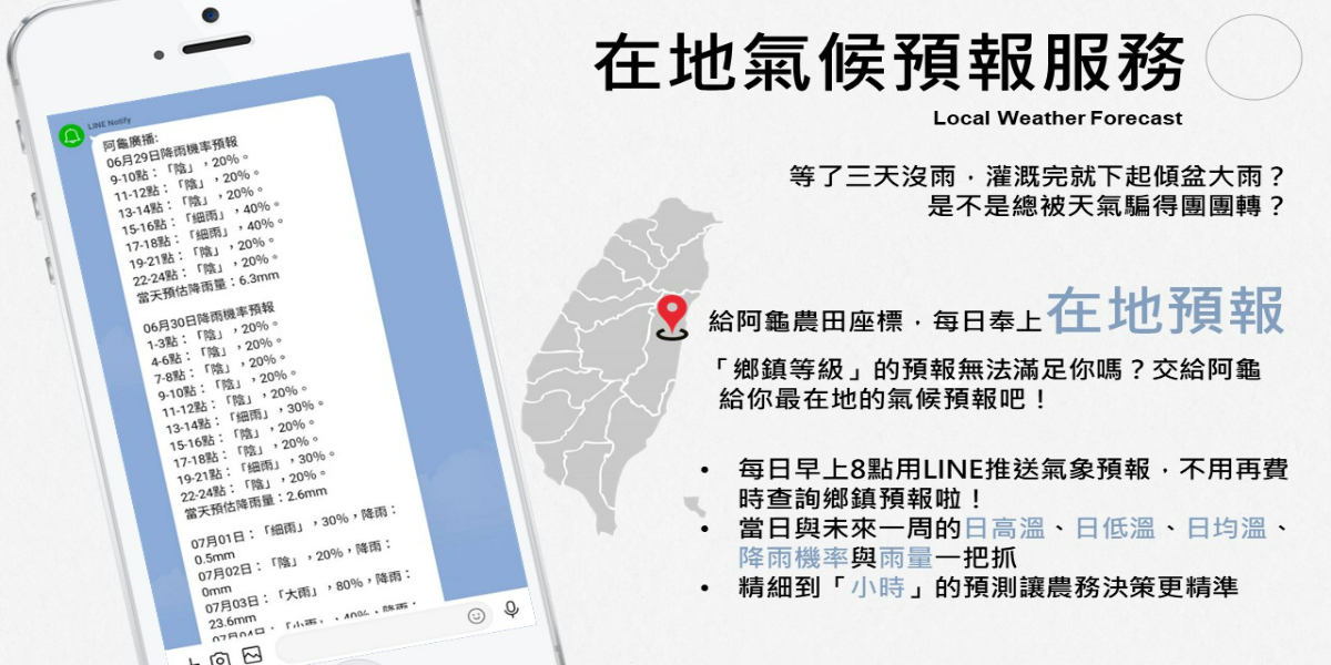 除了即時環境數據,阿龜與全國最大氣候服務公司合作,提供在地氣候預報服務,建立專有LINE群組,使用者可自行挑選預報項目,每日提供指定地點未來一周氣象預報資訊。