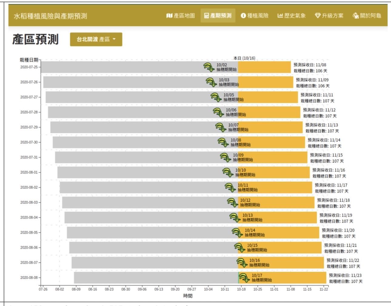 2.生長期預測模型建立:若您擁有3年以上作物關鍵生長期的調查資料,我們能夠協助您以此資料為基礎建立生長期預測模型,建立完成後,您未來便可以自行設定栽培工作曆,系統便會依生長期推算更新,協助使用者掌握未來工作排程。