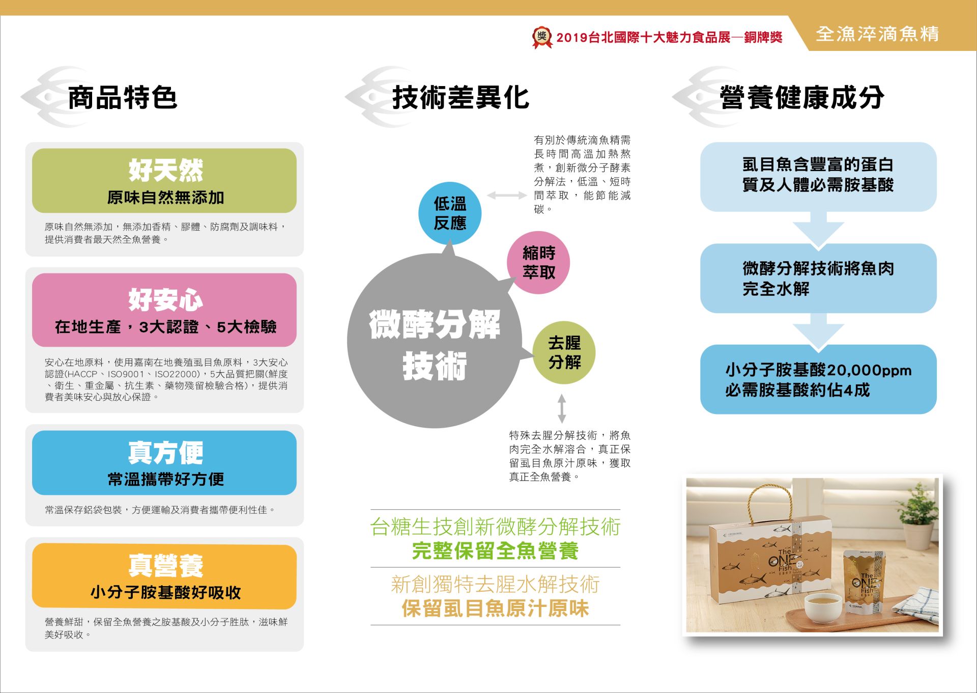 虱目魚含有豐富的蛋白質及人體必需氨基酸,相較於其他禽畜肉類,魚肉中的蛋白質更易為人體所消化吸收。本產品保有虱目魚多種胺基酸和小分子胜肽營養,其中小分子胺基酸含量高達50,000ppm,當中所含人體必需胺基酸含量亦高達20,000ppm,所含小分子胜肽,人體吸收快速,特別適合病弱、老人、產後親餵泌乳和小孩的營養補給,效果更加倍,常溫保存鋁袋包裝技術,提供隨行攜帶,讓您外出也能享受健康美味及營養。