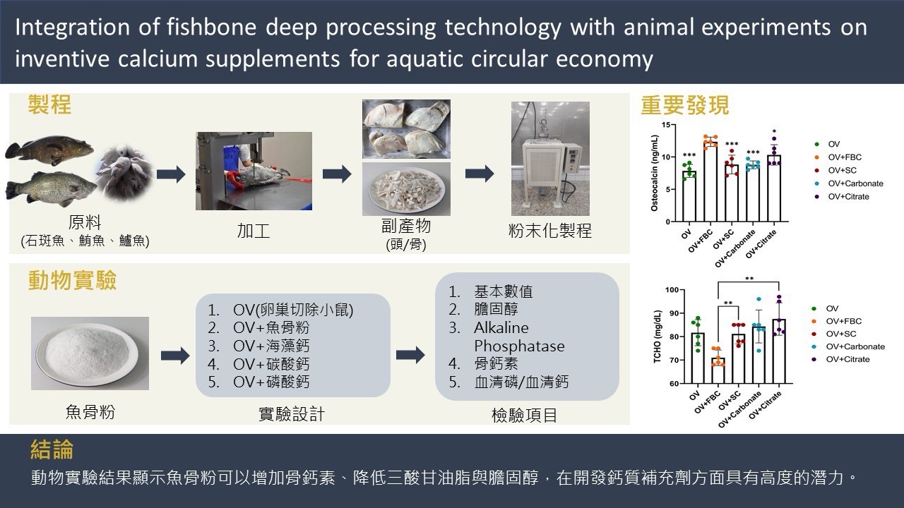 以魚頭魚骨為原料製成保健產品,成分天然、無副作用且內含貼近人體所需之鈣、鉀、鎂、磷、鋅、硒等營養元素,其中鈣磷比例約2:1,最能有效連結人體骨骼結構。並參考衛福部「健康食品之骨質保健功效評估方法」,使用卵巢切除小鼠,進行為期12週之動物實驗。實驗結果得知魚骨粉可有效增加骨鈣素、降低膽固醇與三酸甘油脂,其骨質保健效果相較於其他天然、化學合成鈣,具有顯著差異。透過循環再利用概念,不僅有效提升水產加工副產物的附加價值,也促進整體產業永續發展。