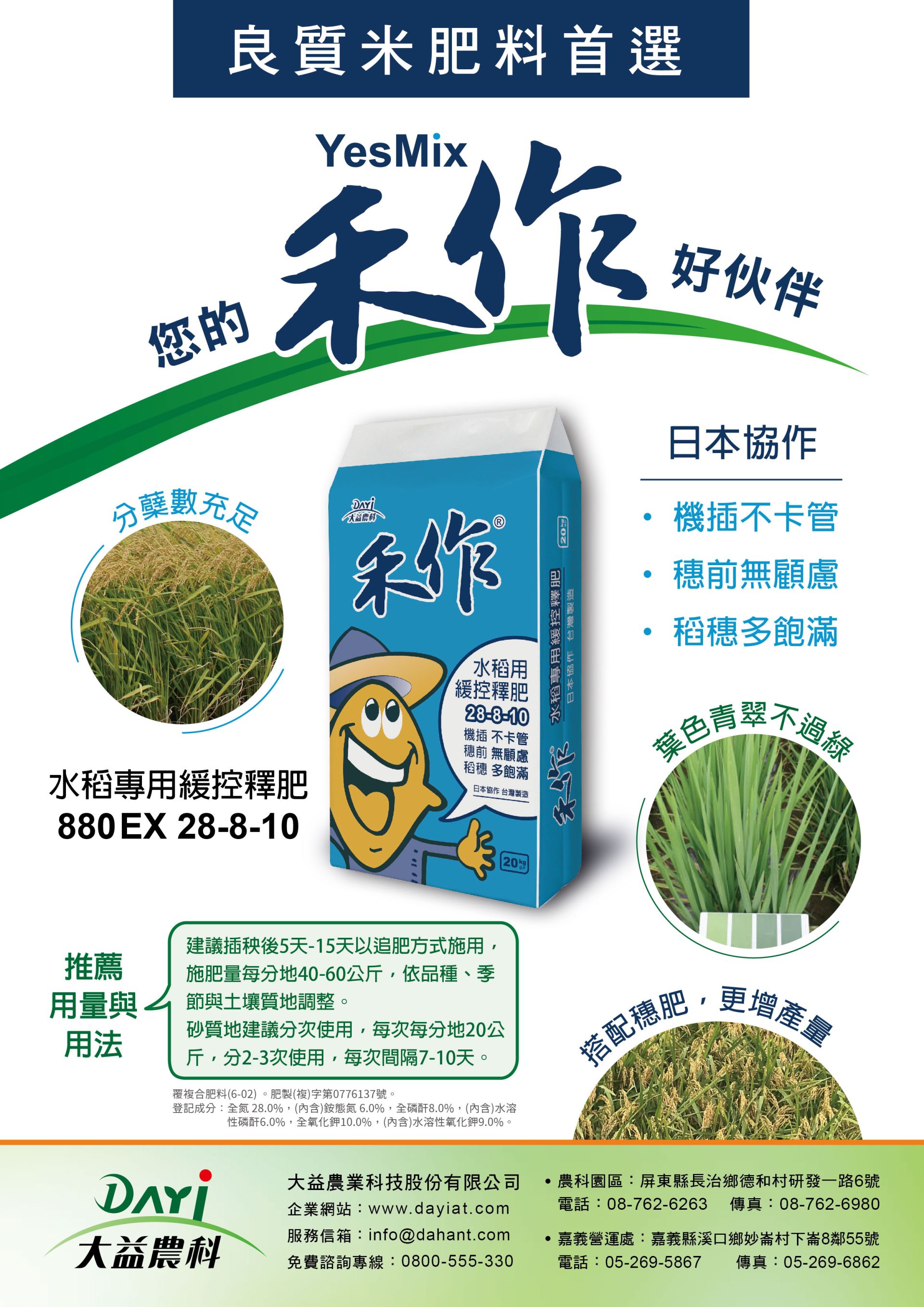 適合水稻生長的氮、磷、鉀黃金比例。持續且穩定的供應養分,提高稻米、穀粒品質。