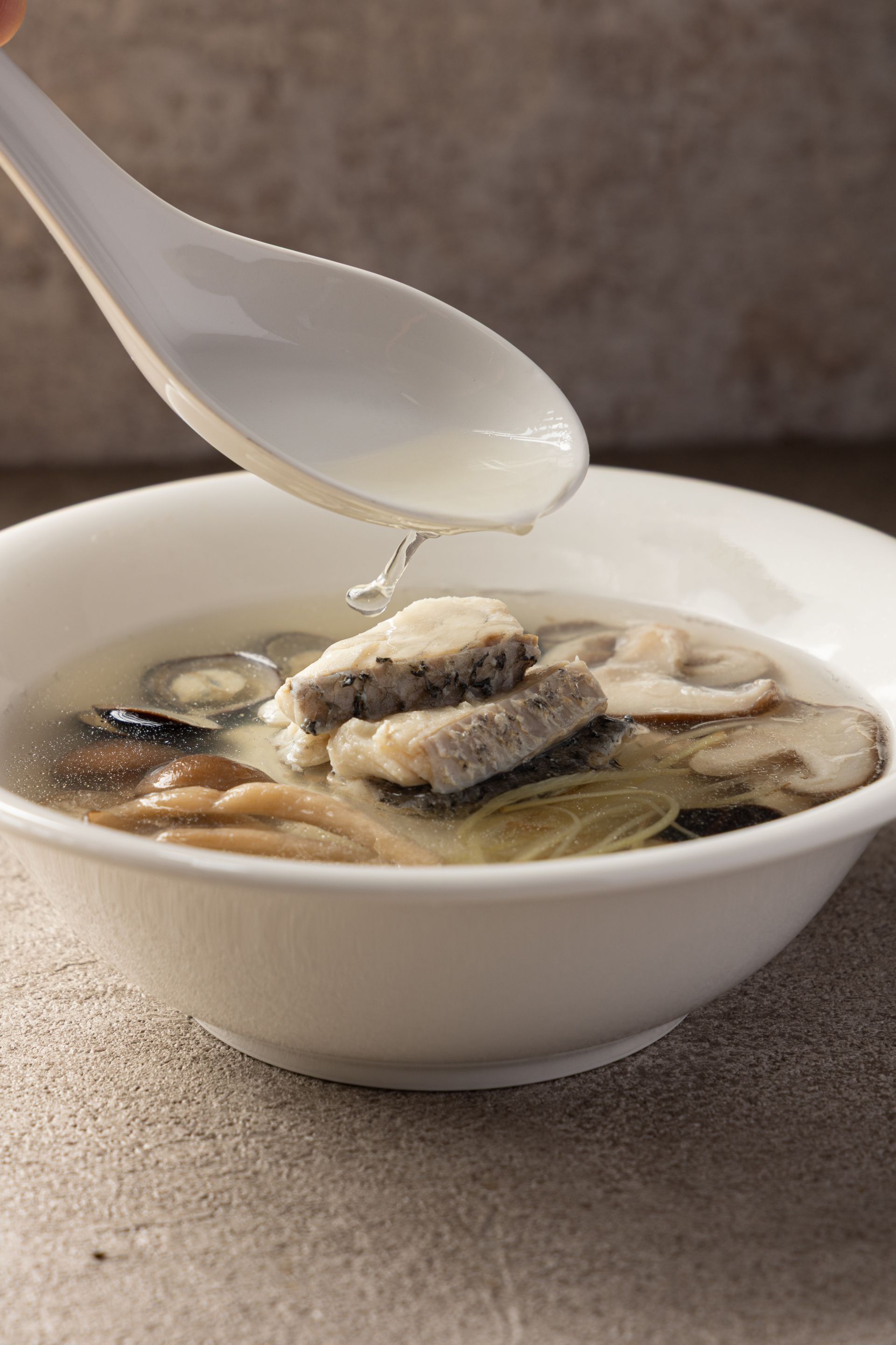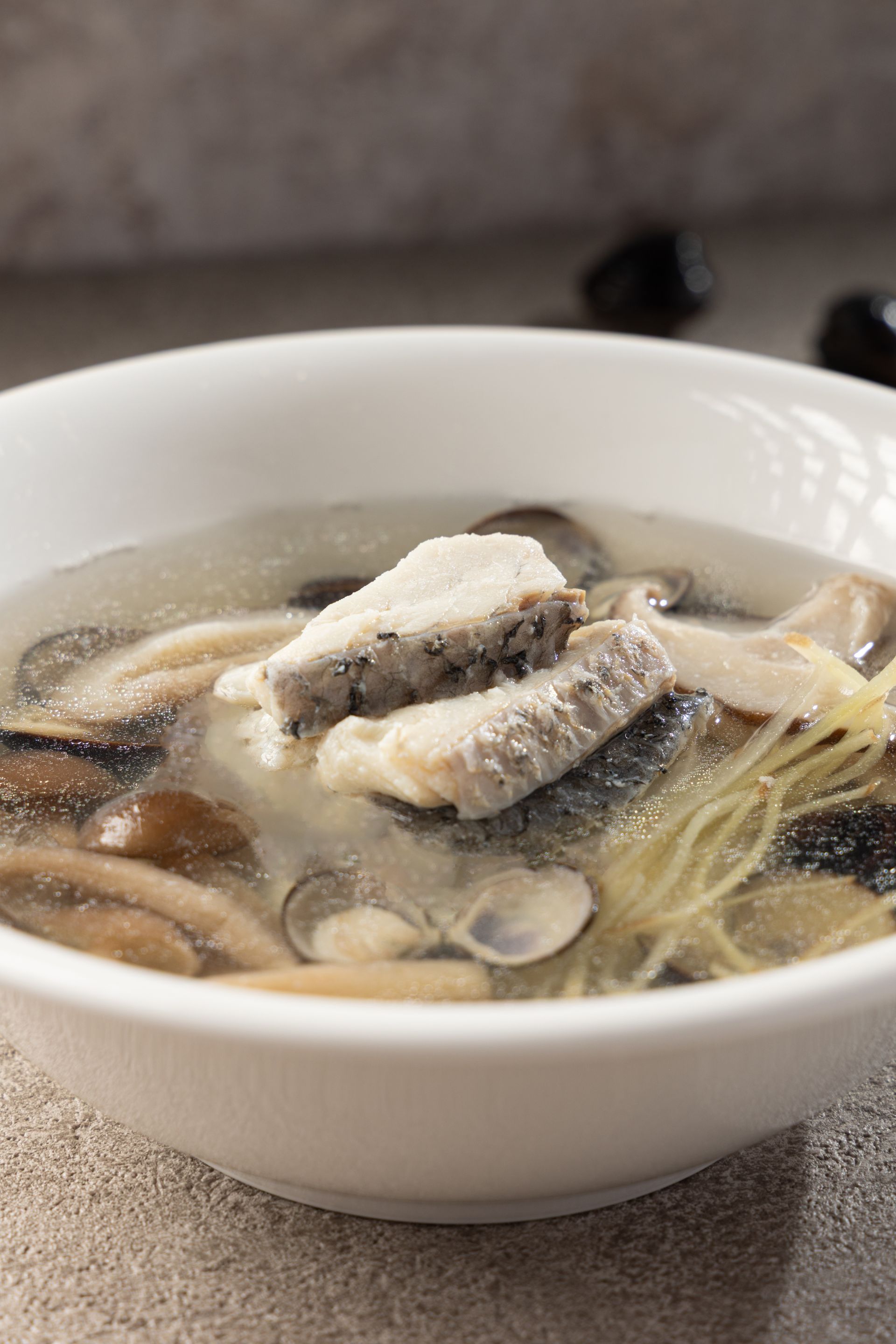 原 料:高湯[(水、鱸魚精100ml)、鹽、酵母抽出物]、鱸魚、黑蜆、