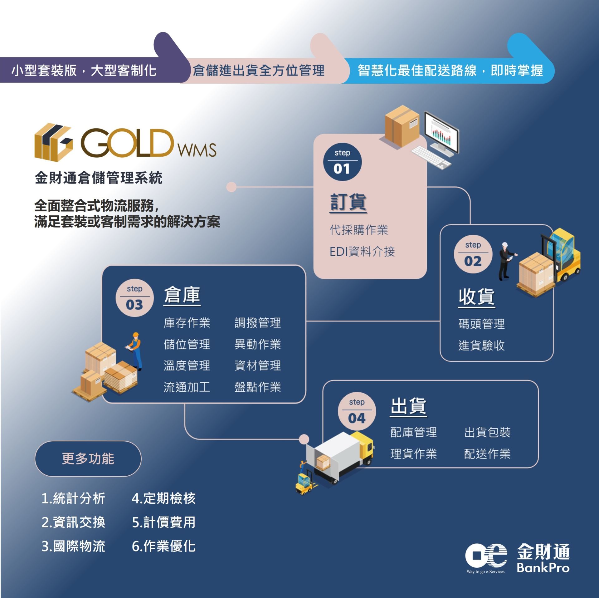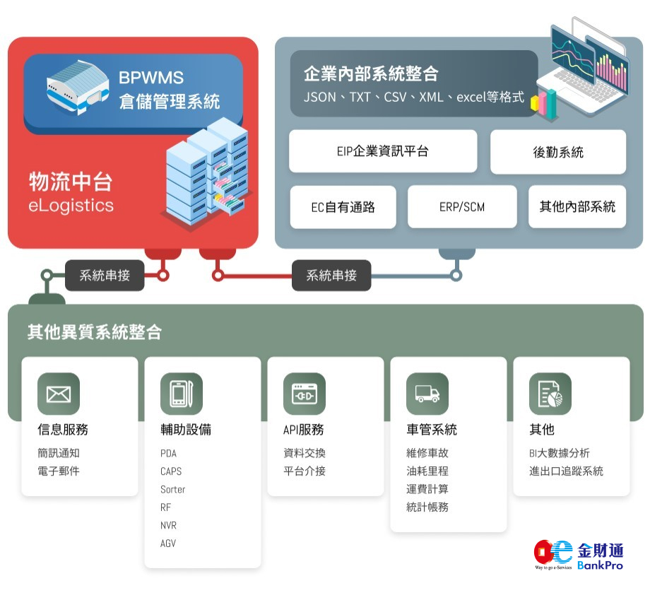 GOLDWMS 搭配金財通開發之iTMS智慧配送系統,提供一條龍整合式物流服務,涵蓋全溫層物流、資訊流、倉儲與配送等。
