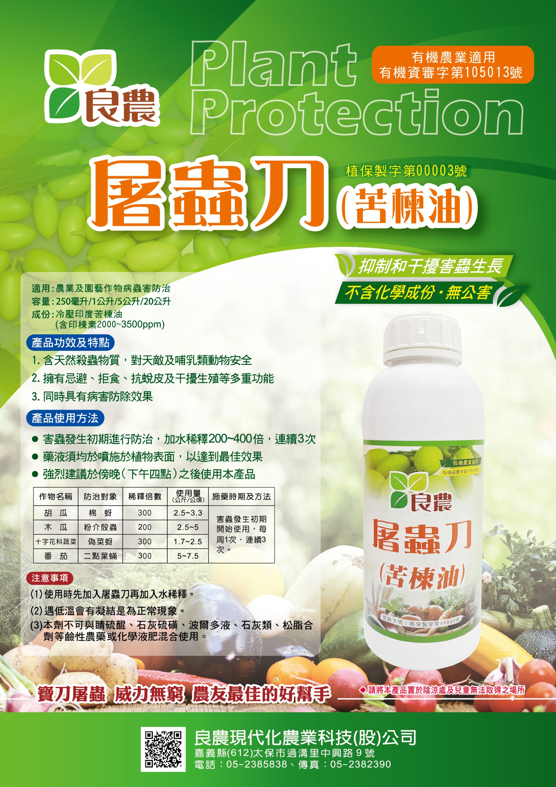 Neem oil is made of neem seed kernels, which contained 1,000~1,500 kg/ml of azadirachtin. Unlike synthetic pesticides, neem oil is pest-specific, biodegradable, non-toxic to humans and other biota. Additional, neem oil may act as repellant, feeding depressant, growth regulator of insects.