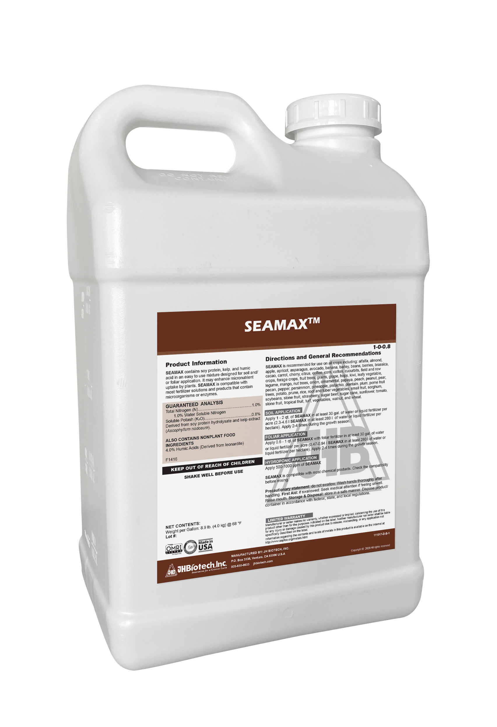 Seamax™ is recommended for use on all crops including: alfalfa, almond, apple, apricot, asparagus, avocado, banana, barley, beans, berries, brassica, cacao, carrot, cherry, citrus, coffee, corn, cotton, cucurbits, field and row crops, forage crops, fruit trees, grains, grape, hops, kiwi, leafy vegetable, legume, mango, nut trees, onion, ornamental, papaya, peach, peanut, pear, pecan, pepper, persimmon, pineapple, pistachio, plantain, plum, pome fruit trees, potato, prune, rice, root and tuber vegetables, small fruit, sorghum, soybeans, stone fruit, strawberry, sugar beet, sugar cane, sunflower, tomato, stone fruit, tropical fruit, vegetables, walnut, and wheat.