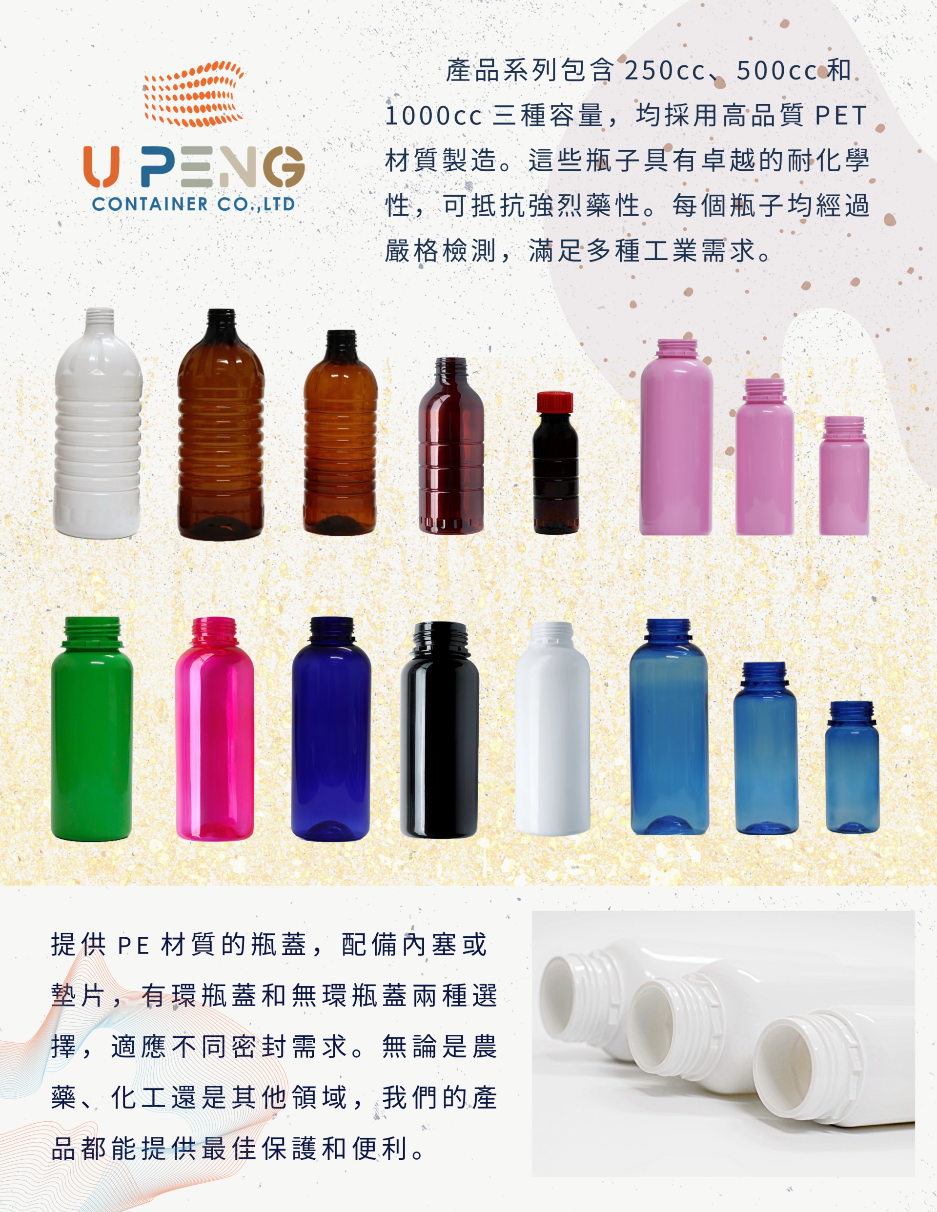 Our product range includes PET plastic bottles with capacities of 250 milliliters, 500 milliliters, and 1000 milliliters, and PE caps.