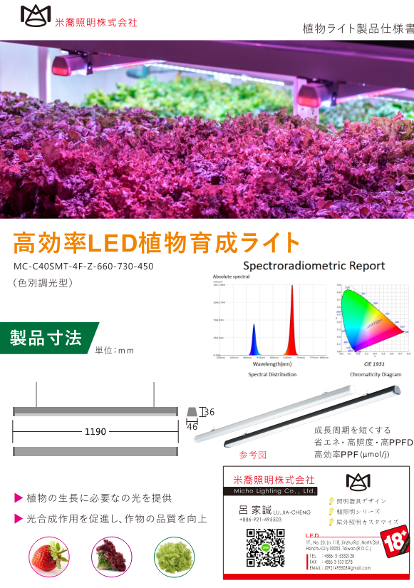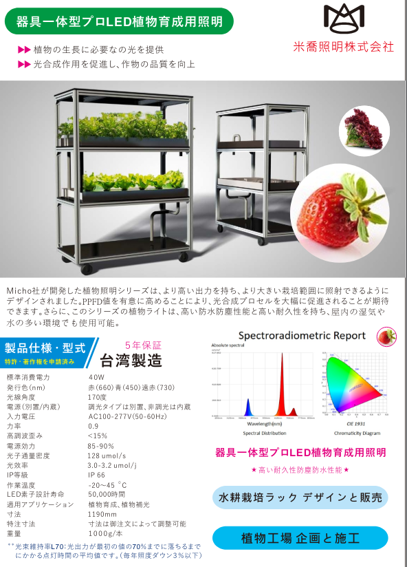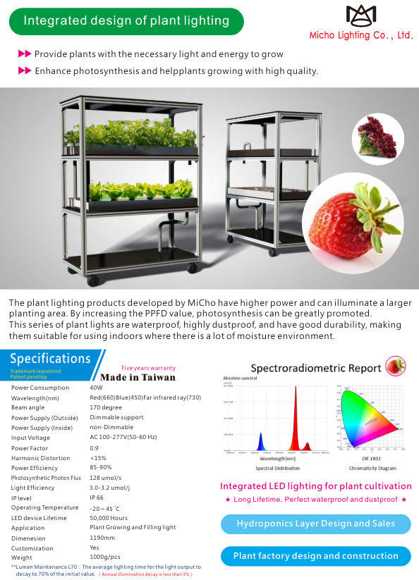 適用棚架室內種植,水耕高經濟價值農作物,提供穩定仿太陽光之植物所需能量,提高產能縮短生長週期,產生高花青素,紅蘿波素,5-10年高壽命植物燈減少成本支出,高光效植物燈創造農作物快速回收成本