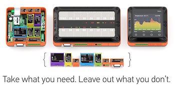 Tibbits — short for “Tibbo Bits” — are pre-packaged I/O modules housed in bright, color-coded rectangular shells.