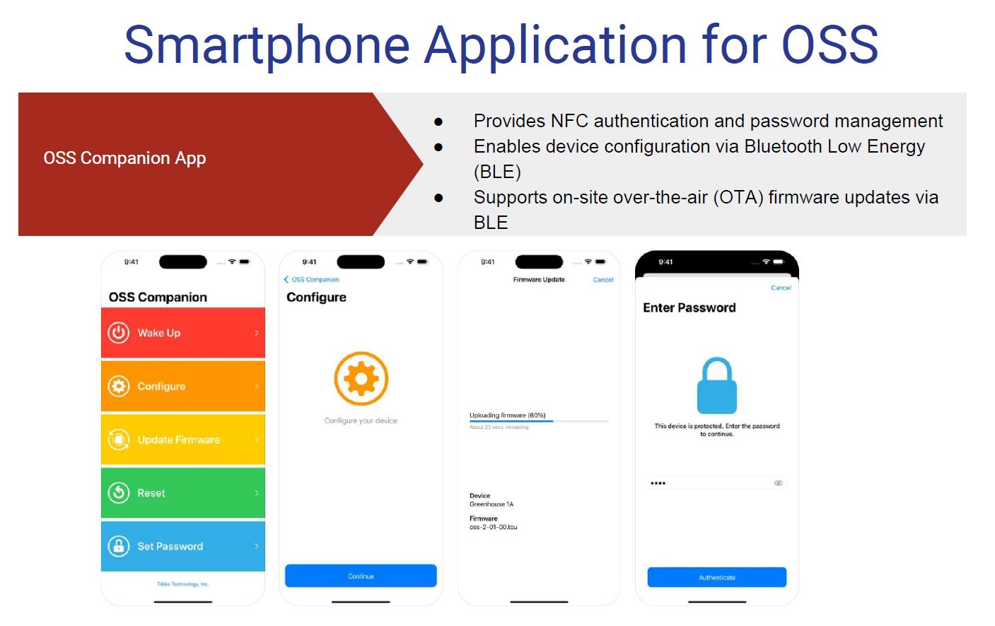 OSS has no physical buttons, preventing unauthorized access. Field configuration is done via the OSS Companion App. After NFC-based secure authentication, setup is completed via Bluetooth.
