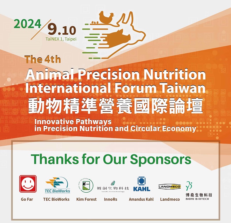Organized by the Chinese Society of Animal Science and the World's Poultry Science Association - Taiwan Branch, the 4th Animal Precision Nutrition International Forum will be held on September 10, 2024, at the 5th floor of the Taipei Nangang Exhibition (TaiNEX) Hall 1.