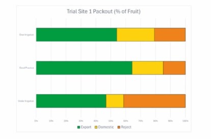 The irrigation refill points were adjusted for the 2024-25 season to reflect this. An example of the irrigation practice changes made from the 2023-24 to 2024-25 season can be seen in the soil moisture graphs below alongside the root activity graph for this period. This change in irrigation practice has resulted in better-quality fruit and an increased export pack out. The fruit is still of good size and colour, but is firmer and has much greener stems, there is also less fruit being rejected or only being fit for domestic sale.The trials have shown following the recommended irrigation practice increased export pack out by approximately 10% from the under and over irrigation sites.