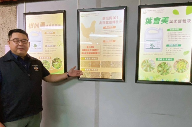 早期生雞糞農民直接當肥料導致孳生病媒蚊、臭味、髒亂問題,無法有效處理雞糞廢棄物,對環境、土壤、空氣品質造成嚴重影響,禽類糞便轉化劑為濃縮物,試驗結果可將生雞糞於短時間內發酵完成,提供小規模飼養戶每日生產雞糞發酵效率,有助降低飼養戶處理成本也實驗於多樣植物種植,結果農作物更健康生長,另也生產根系、葉面有機肥,備受農友青睞。